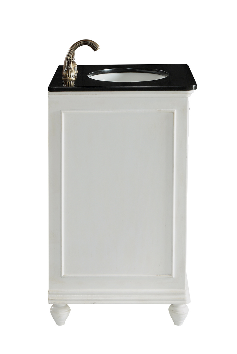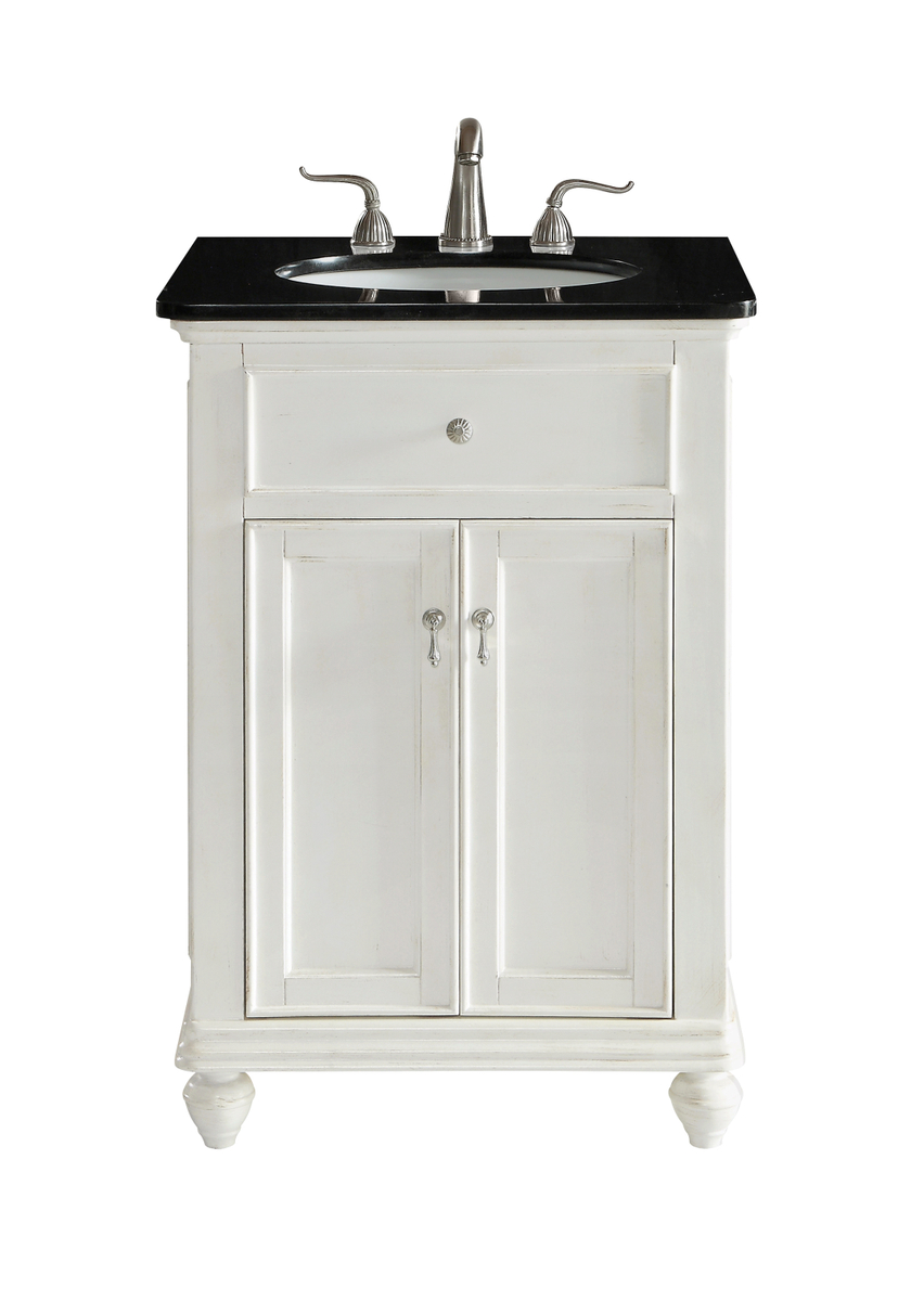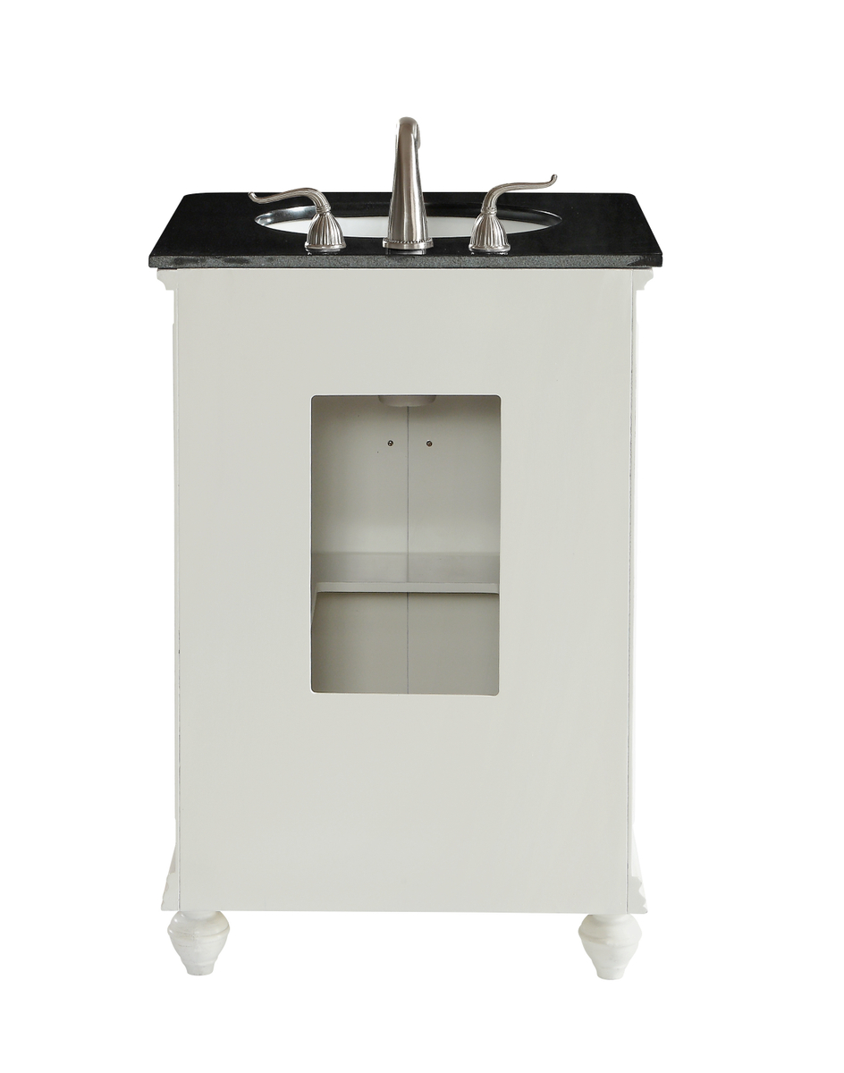 A sleekly styled 2 door, granite-topped bathroom vanity like this can only bring a smile of appreciation for its simple beauty and clean lines. With an authentic black granite counter top, oval white porcelain sink, hand painted antique white cabinet, 2 soft-close doors with a shelf inside, brushed steel hardware, carved bun feet, this elegant, transitional vanity balances form and function. Measurements: W24xD21xH35
