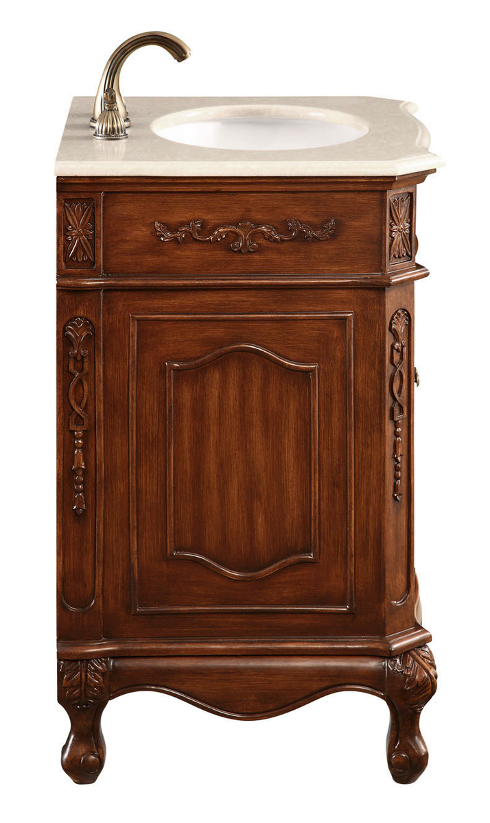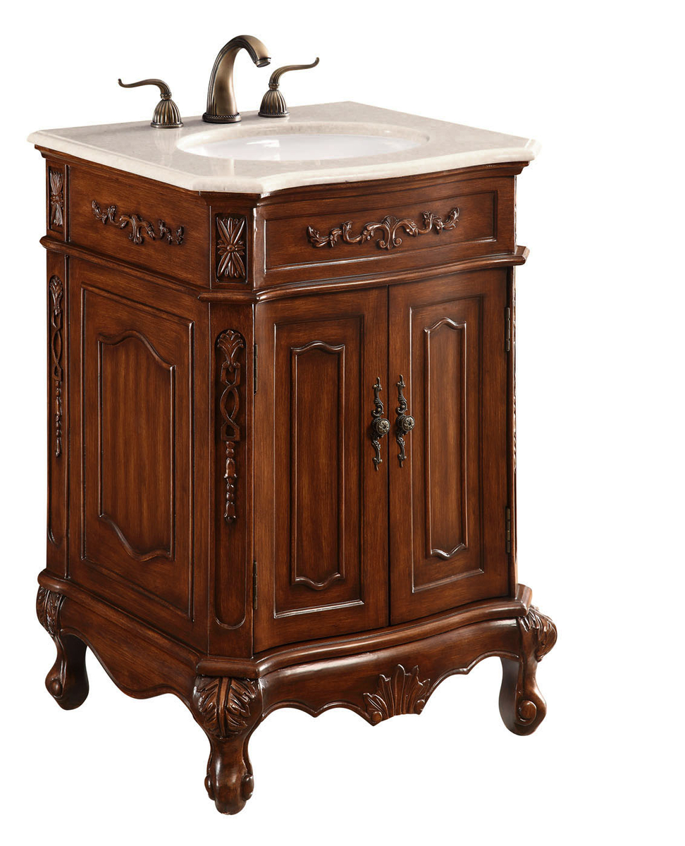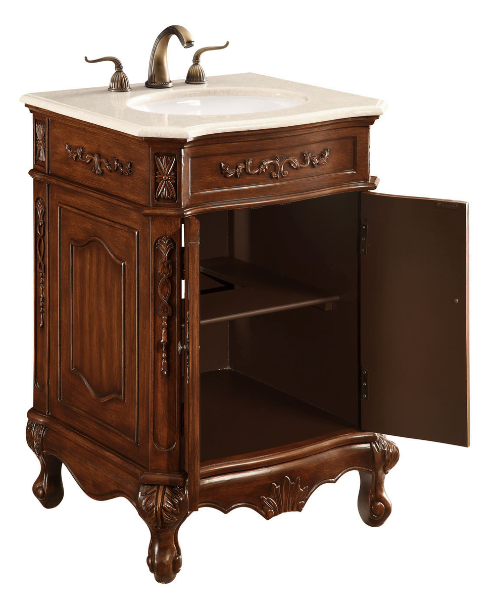 This superb balance of timeless tradition and opulent beauty in a marble-topped 2 doors vanity will certainly enhance the aesthetics of any home or office bathroom! Featuring an authentic Cream marble countertopoccasionally with light brown veining, complimenting the hand painted antique teakwood finish cabinetoval white porcelain under mount sink, a superbly carved floral design, stylishly carved solid wood French scroll feet, as well as antique bronze finish door knobs. A truly rich statement of luxury! Measurements: W24 x D21 x H36.