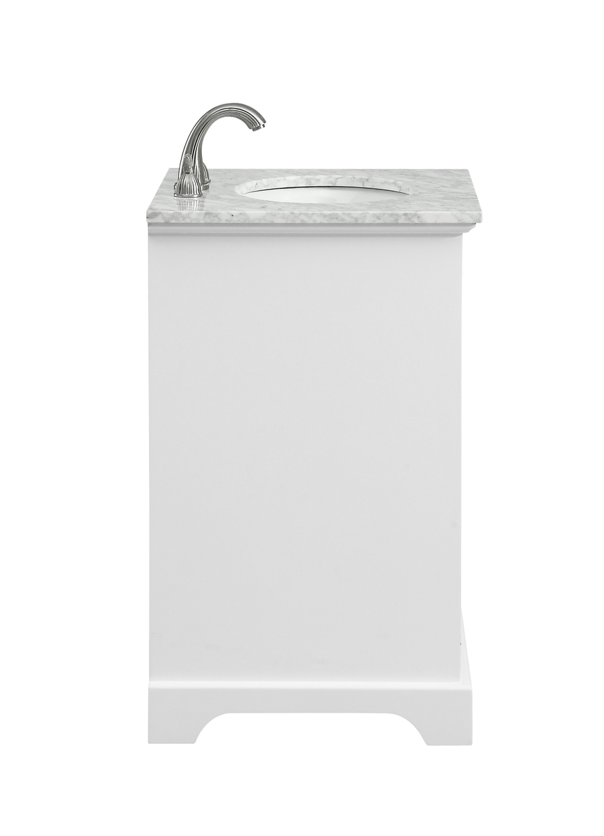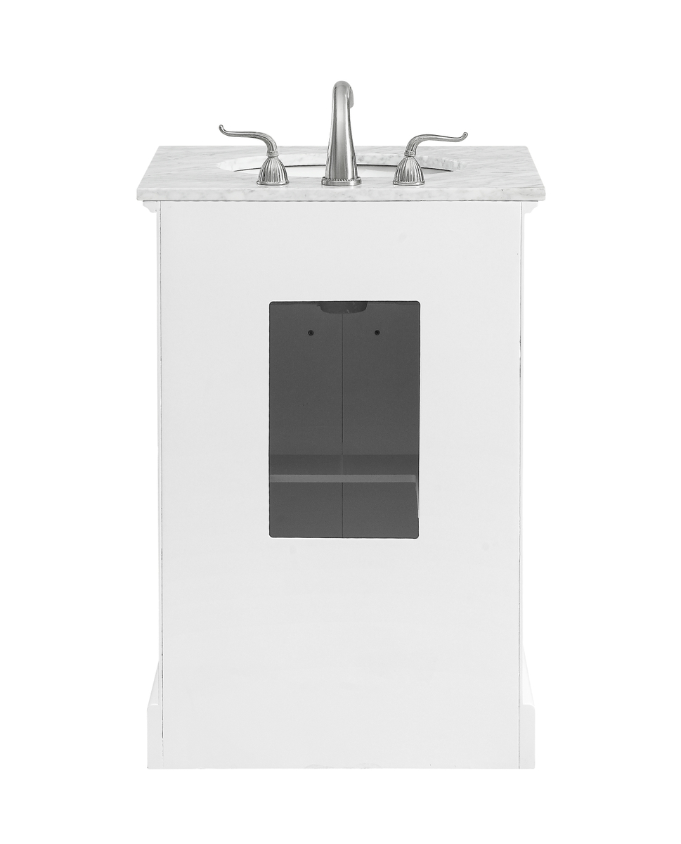 From its Italian Carrara white marble top to its contemporary-styled hand painted white cabinet, this member of our Americana vanity collection is sure to enhance either your home or office bathroom. Beneath its lustrous, natural marble top and an oval, white porcelain under mount sink, a handsome 2-door cabinet with a Single shelf for all your bathroom essentials, highlighted with recessed panel doors, brushed steel bar handle and knobs, stands on strong solid pedestal feet. A wonderful balance of simplicity and practical function! Measurements: W24xD21.5xH35