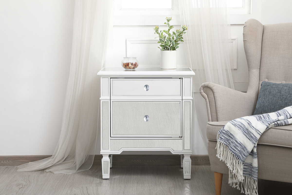 Make a striking statement with this gleaming mirrored end table and live in the elegantly sleek future. Its contemporary style is defined by the alternating panels of polished beveled mirror panels. Its alternating panels that wrap around the entire cabinet creates an amusing design that everyone will enjoy and marvel at. Place this end table in your home and adorn it with your favorite objectscaptivating art pieces, beautiful floral arrangements, or even personal treasures like family portraits. Note this is designed to appear as two faux drawers but it’s actually one door. Ships fully assembled with the exception of installing the legs.