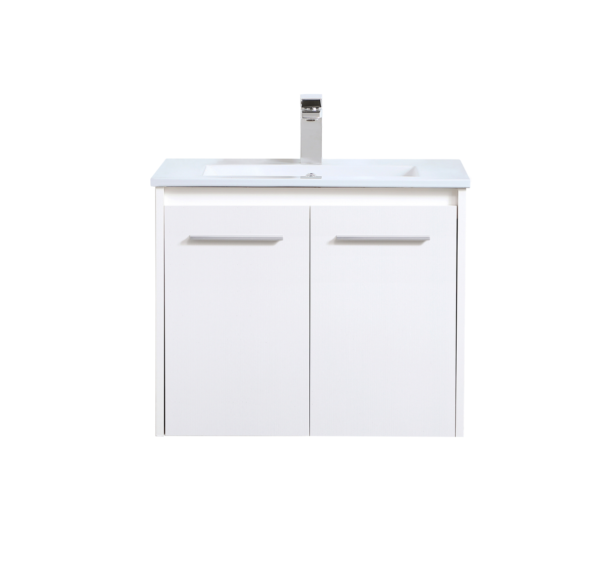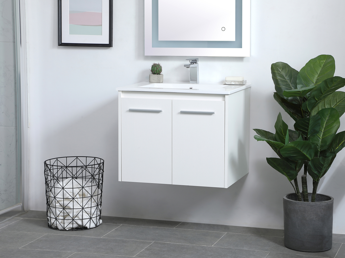 The contemporary simplicity of this 24″ floating vanity in a white finish will help open the space and add stunning modern flair to your bathroom or powder room. The open space below makes it easy to show off your tiles and to clean the floor with ease–it’s also the perfect place for a hamper. Double doors open to reveal plentiful of storage pace to store all of your bathroom miscellany. The clean lines that permeate through the design will surely create a fresh look in your home.