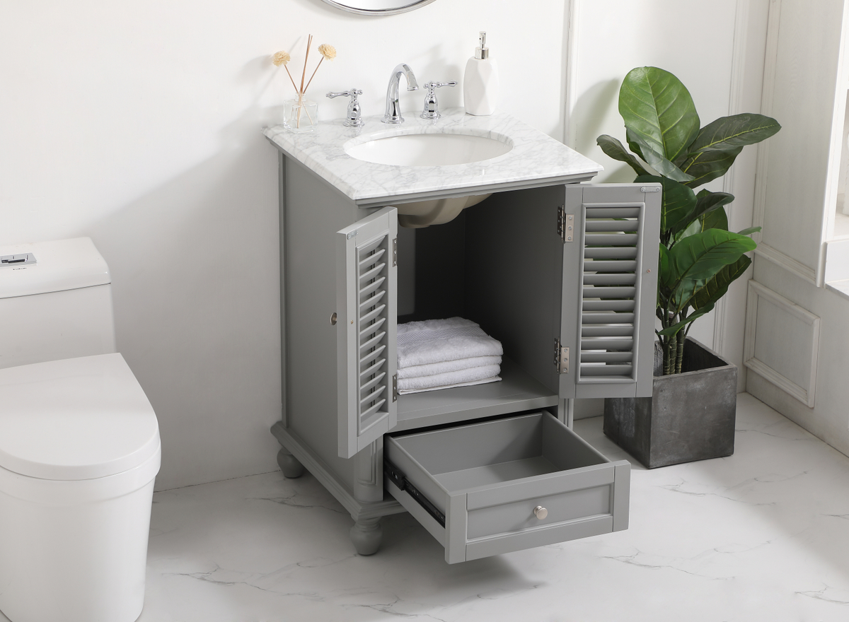 A small space doesn’t mean you have to settle for less. The Rhodes collection compact vanity will add lovely sophistication and complement any small bathroom or powder room, while utilizing its charm and function to provide you with ample storage spaces. Metal round knobs gently adorn the shuttered cabinet door and drawer at the base, allowing for you to store away your bathroom essentials. The Carrara white marble countertop, porcelain undermount sink, dignified subtle engravings on the side edges, and rounded legs all come together to create contemporary beauty. Work with your space, and design a beautiful room, no matter the size.