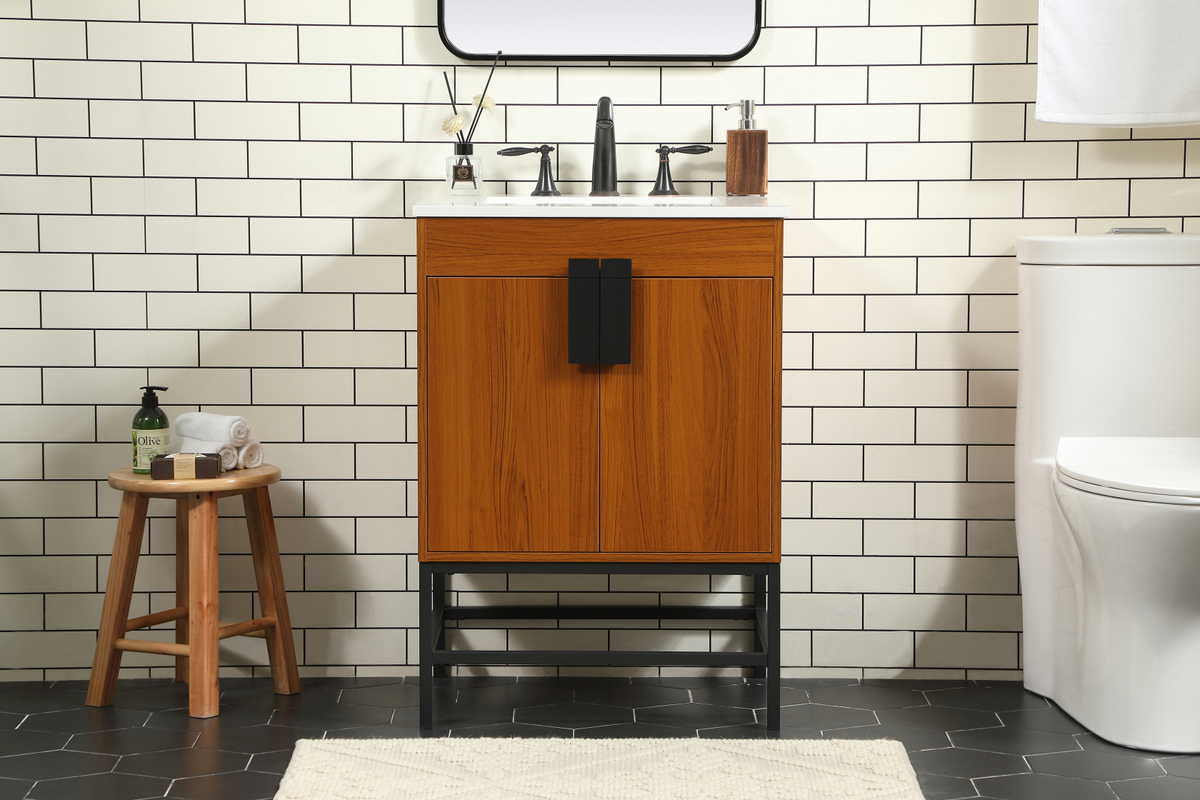 This vanity is a sleek-looking piece of bathroom furniture that is easy to incorporate into your design scheme. The cabinet features a smooth door panel with an oversized steel handle and soft close hinges provide ample room for accessories. Constructed of engineered wood, the powder-coated metal rod legs are an urban industrial look that we love. Minor assembly of the metal legs needed to get this vanity up and running.