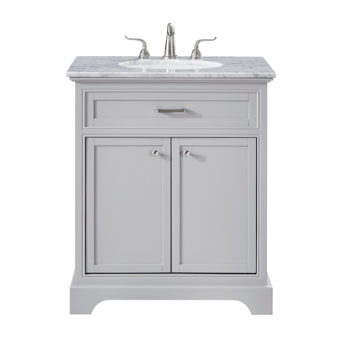 From its Italian Carrara white marble top to its contemporary-styled hand painted soft grey cabinet, this member of our Americana vanity collection is sure to enhance either your home or office bathroom. Beneath its lustrous, natural marble top and an oval, white porcelain under mount sink, a handsome 2-door cabinet with a Single shelf for all your bathroom essentials, highlighted with recessed panel doors, brushed steel bar handle and knobs, stands on strong solid pedestal feet. A wonderful balance of simplicity and practical function! Measurements: W30xD21.5xH35