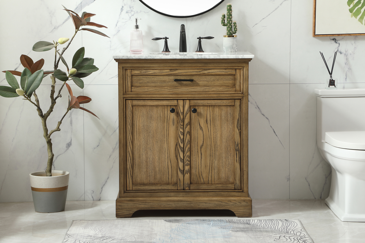 Clean lines and classic form can truly add a fresh look to your bathroom or powder room. This vanity, complemented by round hardware, will surely charm you with its confident style and subtle charisma. This vanity can store all of your bathroom toiletries, from extra towels to make up essentials. The vanity is crowned with carrara white marble and includes a porcelain undermount sink–adding both function and form that will truly amaze.