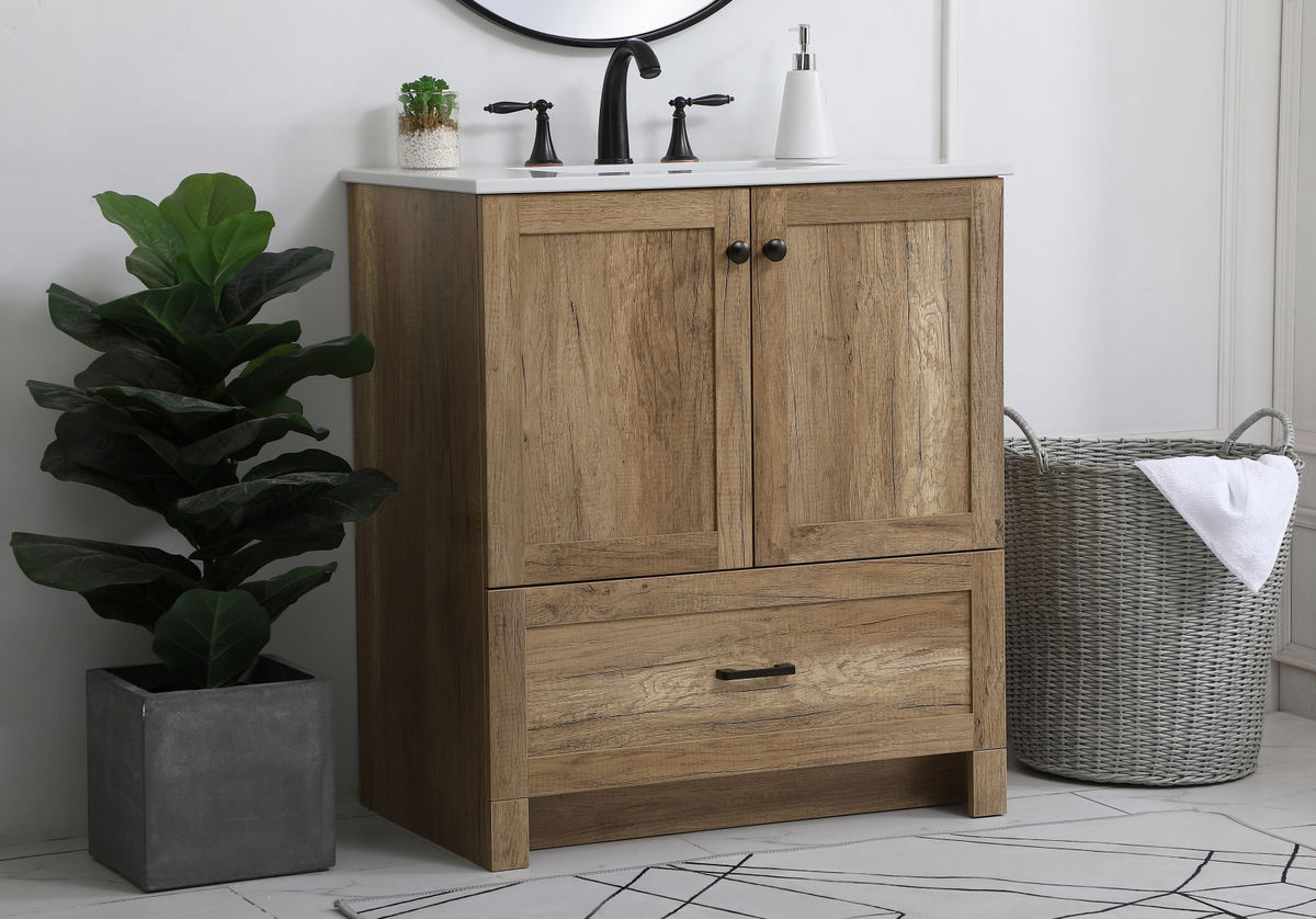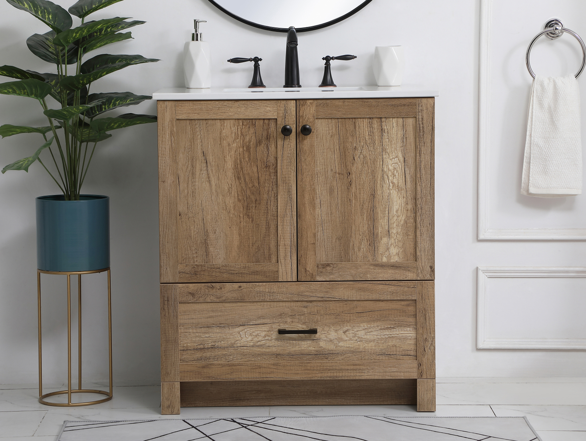 Delve into a world of minimalistic fashion and contemporary styling with this farmhouse 30″ vanity. The clean faux lines anchors the weathered design. Black handle adorns the two doors hiding the base of the integrated porcelain sink while the bottom drawer allows you to store your bathroom necessities and toiletries. The compact size makes it the perfect vanity for any bathroom or powder room, regardless of size.