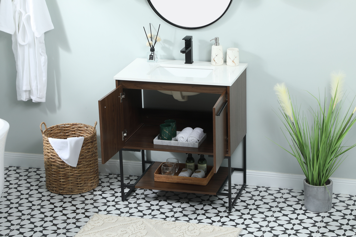 Live in modern comfort with this 30″ walnut finish vanity. Dressed in a walnut and sleek black metal hardware, its contemporary style will have your bathroom or powder room elevated in industrial sophistication. The open shelf at the base and two doors reveal ample storage space for your bathroom essentials and miscellany. Clean lines create its own visual interest, adding trendy looks to your already chic room.