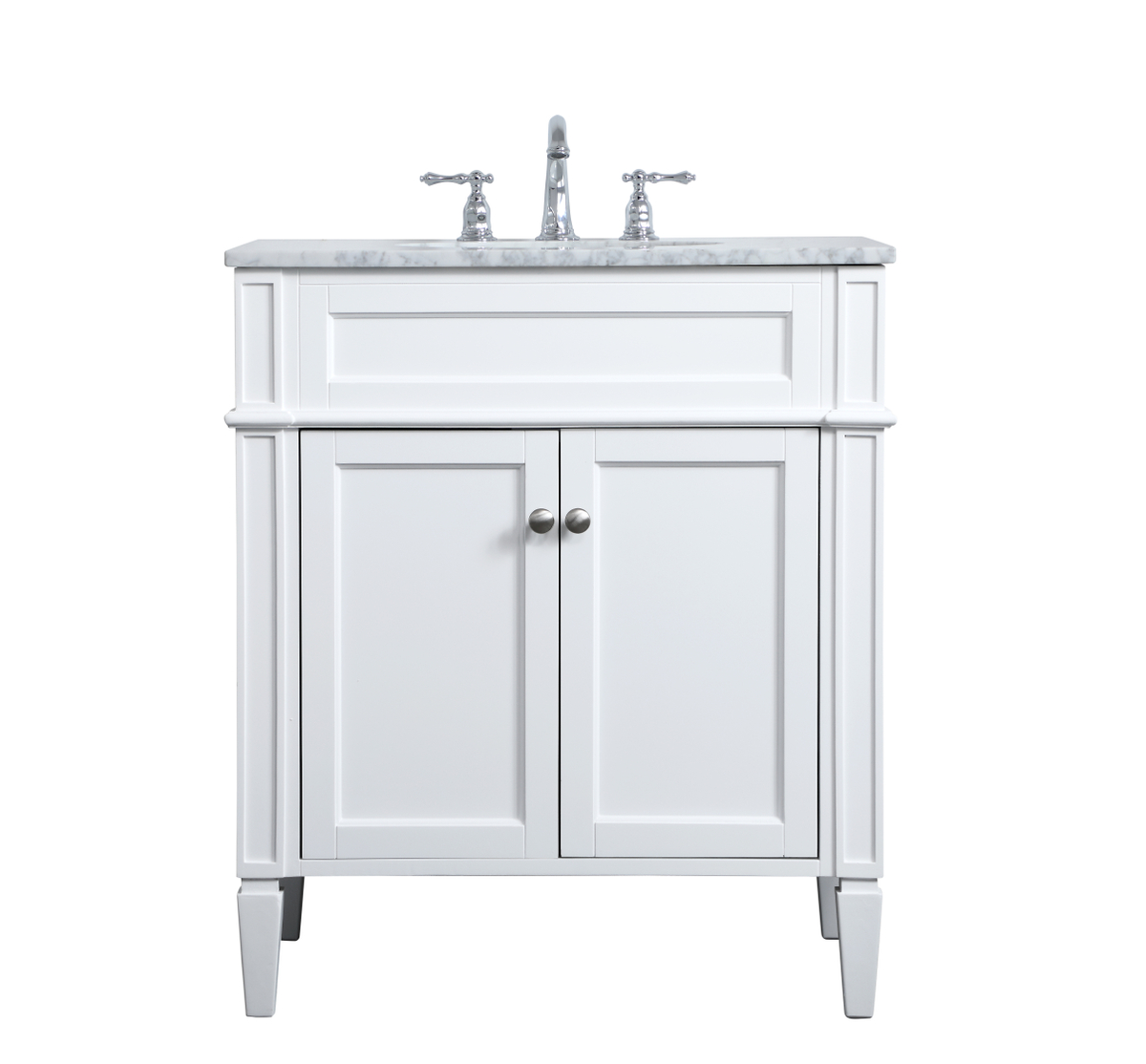 Modern sophistication is defined within the urbane white finish and brushed steel knobs of this compact vanity. Its length makes it the perfect addition to any sized home, and saves space with its storage area hidden behind the double cabinet doors. Topped with a Carrara white marble counter top and a porcelain sink, this design will add everlasting class to your bathroom and powder room.