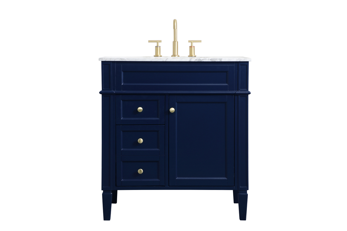 Modern sophistication is defined within the urbane blue finish and brushed gold knobs of this vanity. Its length makes it the perfect addition to any sized home, and saves space with its storage area hidden behind the Single cabinet door and 3 side drawers. Topped with a Carrara white marble counter top and a porcelain sink, this design will add everlasting class to your bathroom and powder room.