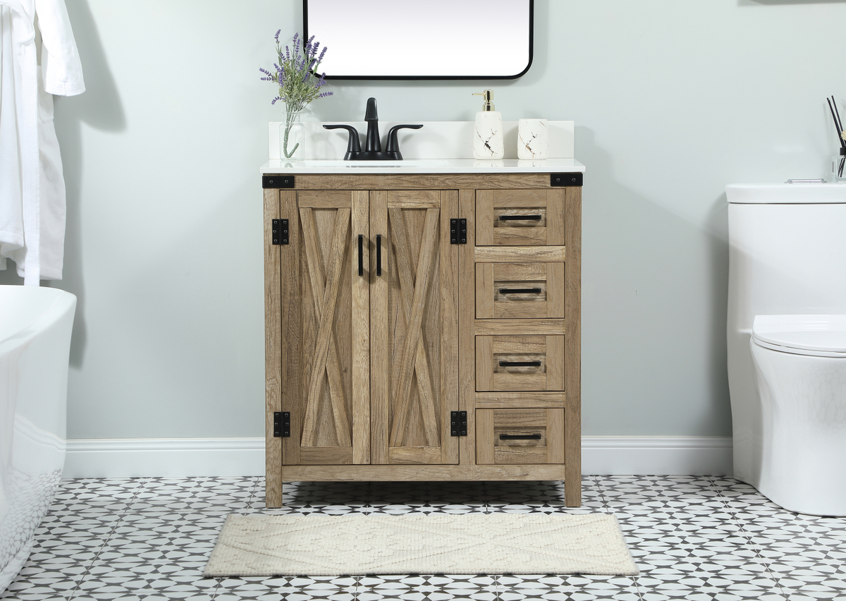 Reminiscent of barn doors, the two door cabinet and four drawers adds both stylistic charm and function with its plethora of storage options for all your bathroom essentials. Whether for your bathroom or the guests’, everyone will marvel at its classic look for traditional and farmhouse aesthetics. A slab of engineered marble rounds out the piece up top, as well as the porcelain under mount sink and predrilled faucet holes. This vanity arrives fully assembled. Comes with a matching backsplash to complete the look and protects your wall.