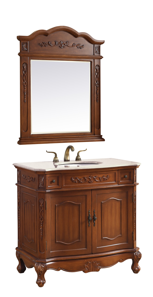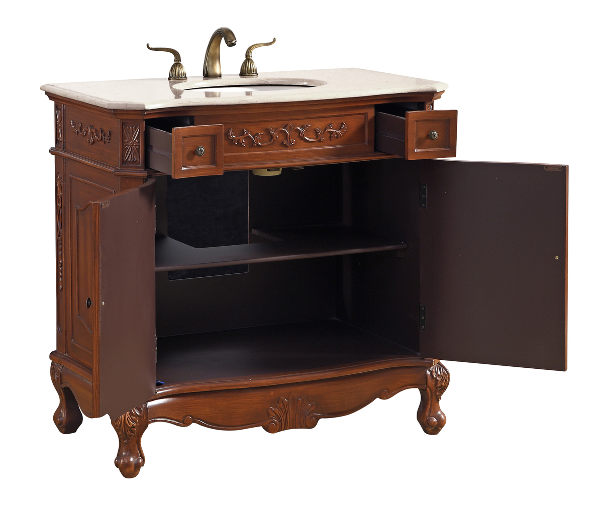This superb balance of timeless tradition and opulent beauty in a marble-topped vanity will certainly enhance the aesthetics of any home or office bathroom! Featuring an authentic natural white marble countertopoccasionally with light brown veining, complimenting the hand painted brown color cabinetoval white porcelain under mount sink, 2 doors with a shelf inside, 2 side drawers, accented by antique bronze finish door knobs, a superbly carved floral design, stands on stylishly carved solid wood French scroll feet. A truly rich statement of luxury! Measurements: W36 x D21 x H35, fully assembled.