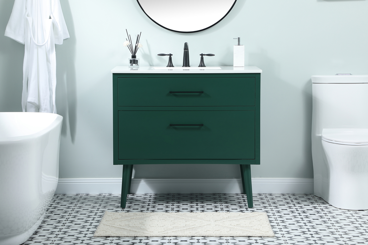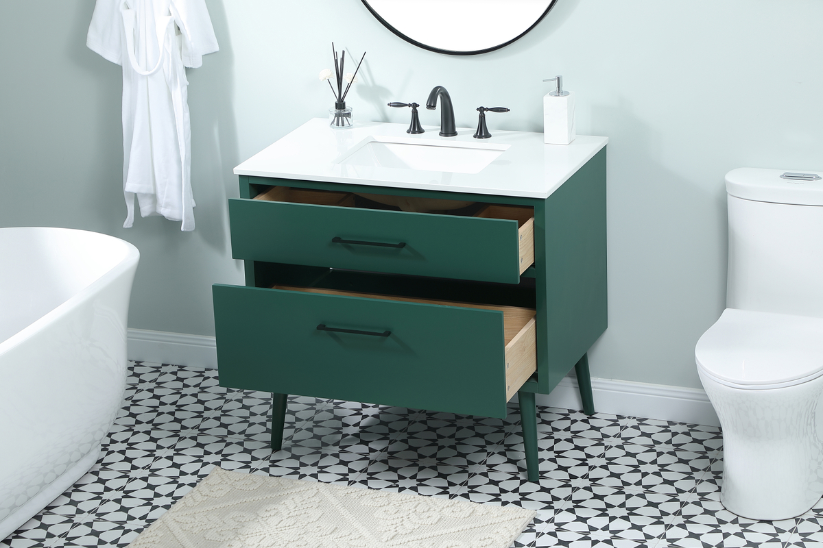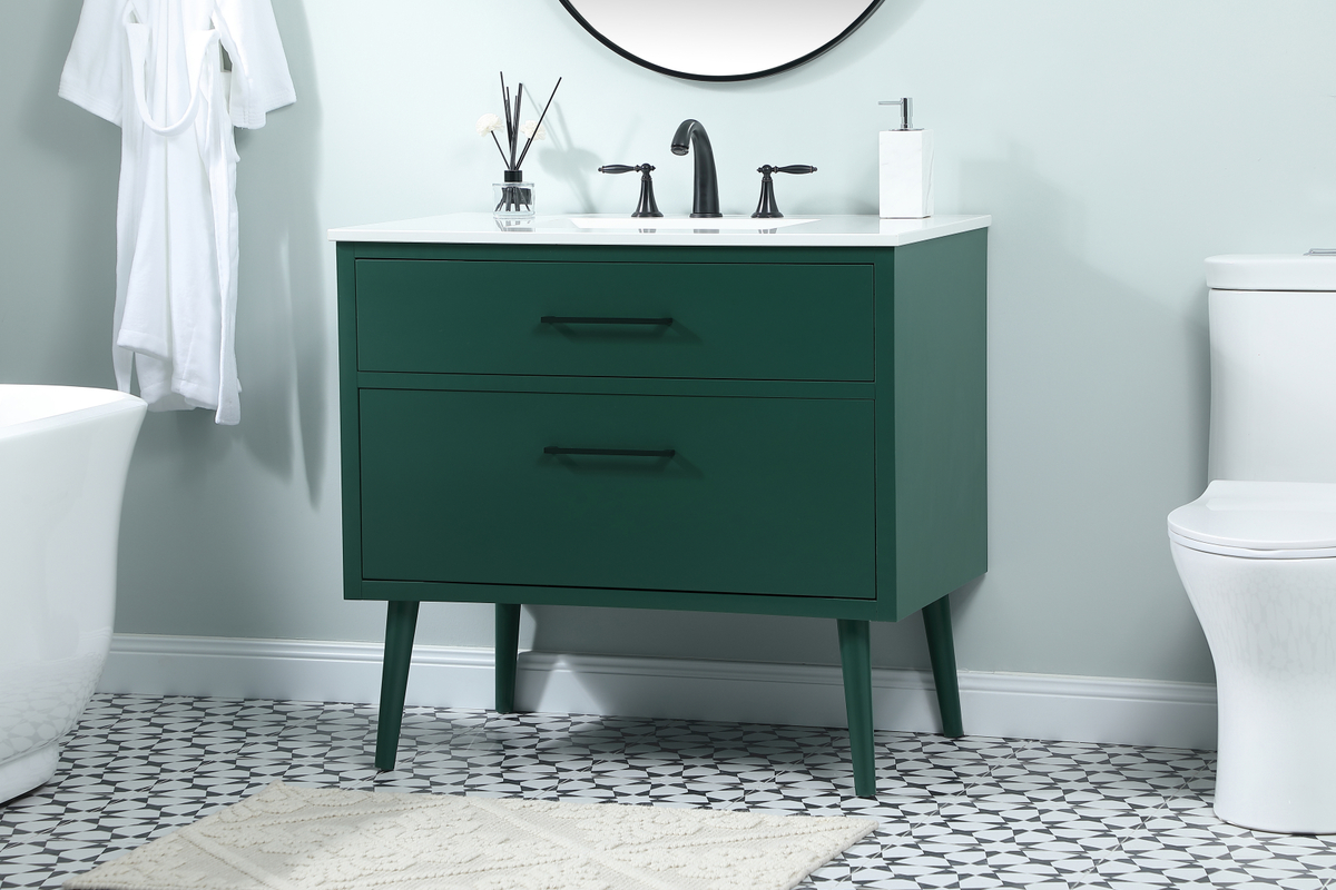 Delve into a world of minimalistic fashion and contemporary styling with this midcentury modern 36″ vanity. The clean lines anchors the design, while the oblique tapered cylinder legs add subtle interest. However, the artful juxtaposition between the green and white top creates a blend of bright modernity and classical traditions. A black handle adorns the top fake drawer hiding the base of the undermount porcelain sink while another one allows you to pull the bottom drawer out, letting you store your bathroom necessities and toiletries. The compact size makes it the perfect vanity for any bathroom or powder room, regardless of size.