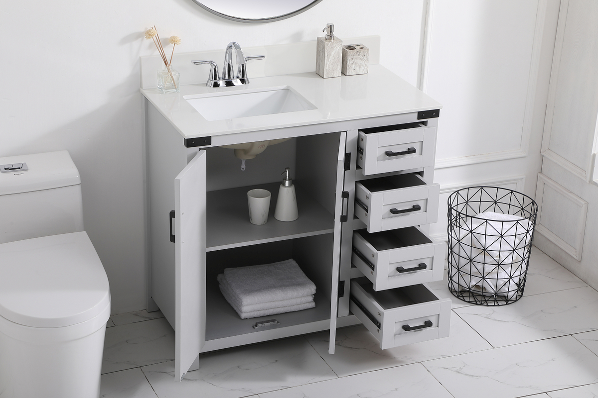 The Grant Collection 36 in. vanity is a practical and stylish upgrade for your bathroom. Its grey finish is highlighted by the engineered white stone top featuring an under-counter rectangular sink. The cross patterned cabinet doors are decorated with bold black hinges and bar pulls. The cabinet has four pullout drawers, ideal for towels, washcloths and bath accessories Comes with a matching backsplash to complete the look and protects your wall.