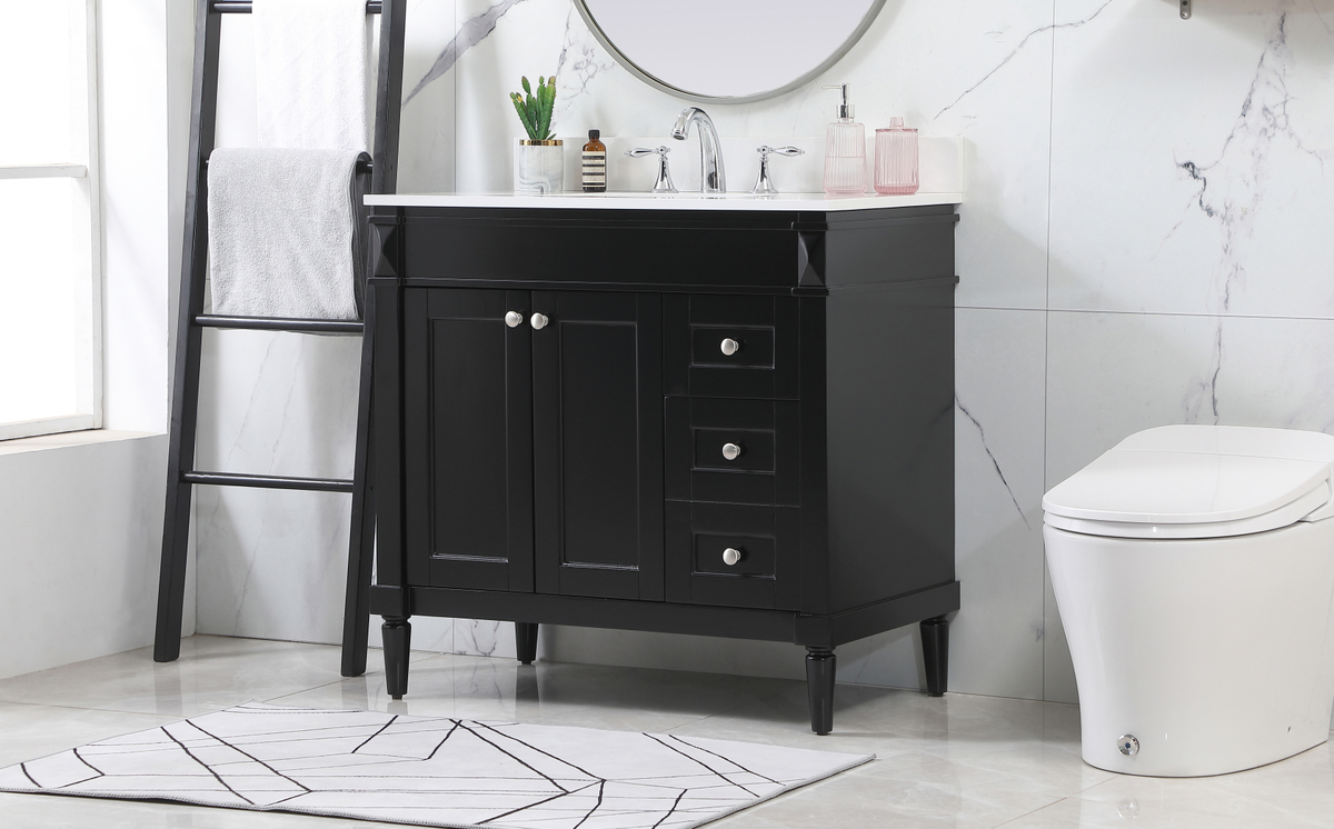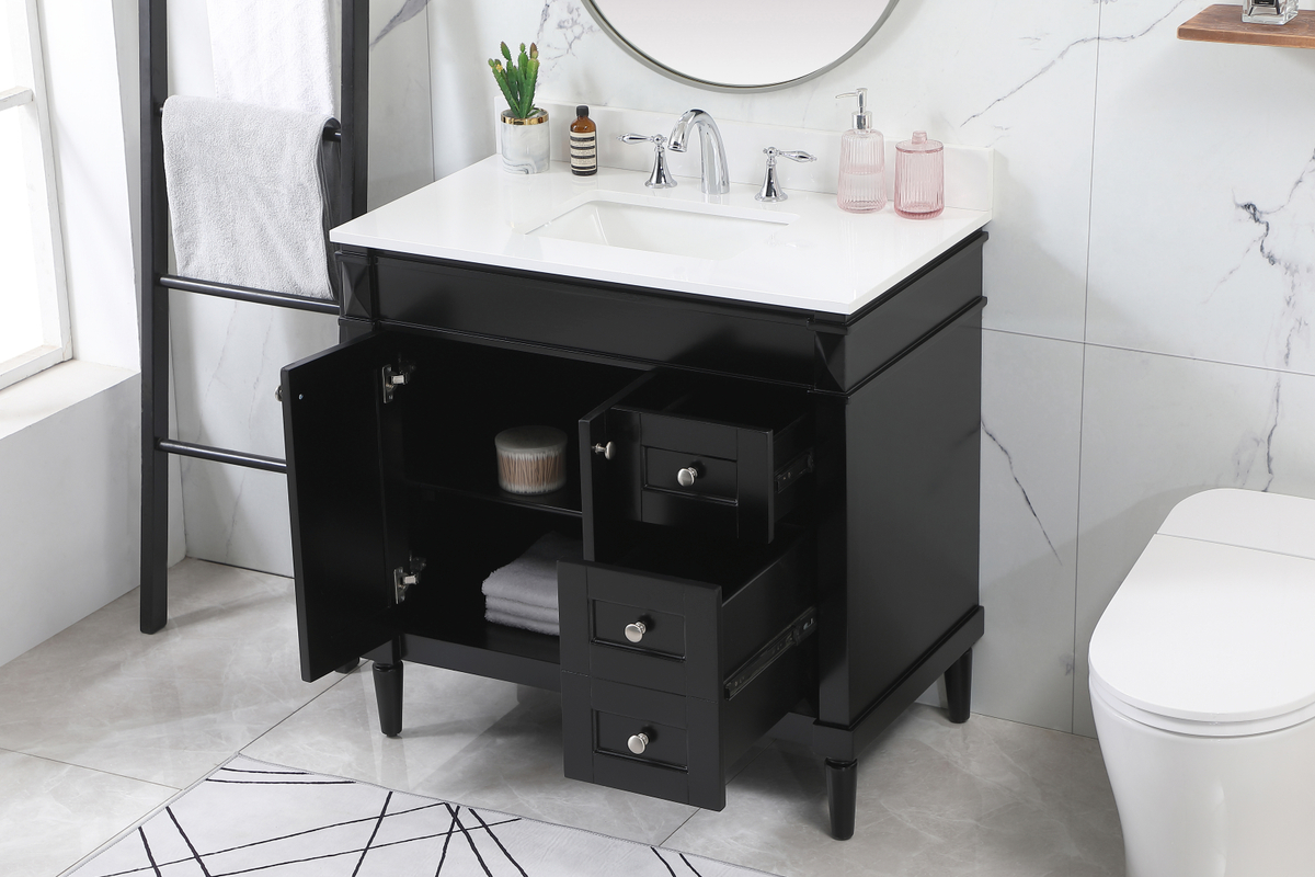 This transitional vanity is a beautiful piece of bathroom furniture will look amazing in your design scheme. The cabinet features a shaker style smooth door panel with simple round knobs and soft close hinges provide ample room for accessories. Packed with multiple side drawers with soft close glides for added comfort and full access to bath supplies. Convenient deep drawer stores all of your tall bath essentials. Constructed of engineered wood and solid wood legs with hand painted finish. The durable engineered marble countertop is a versatile material in an ivory white finish. Minor assembly of the legs needed to get this vanity up and running. Comes with a matching backsplash to complete the look and protects your wall.
