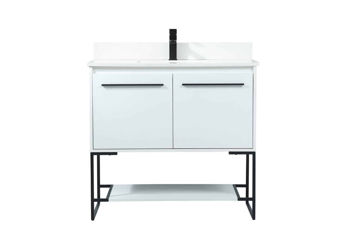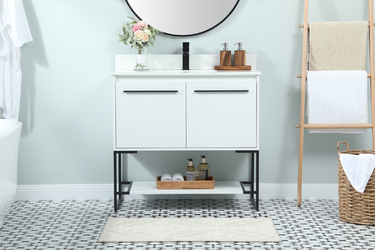 Live in modern comfort with this 36″ white finish vanity. Dressed in a white and sleek black metal hardware, its contemporary style will have your bathroom or powder room elevated in industrial sophistication. The open shelf at the base and two doors reveal ample storage space for your bathroom essentials and miscellany. Clean lines create its own visual interest, adding trendy looks to your already chic room. Comes with a matching backsplash to complete the look and protects your wall.