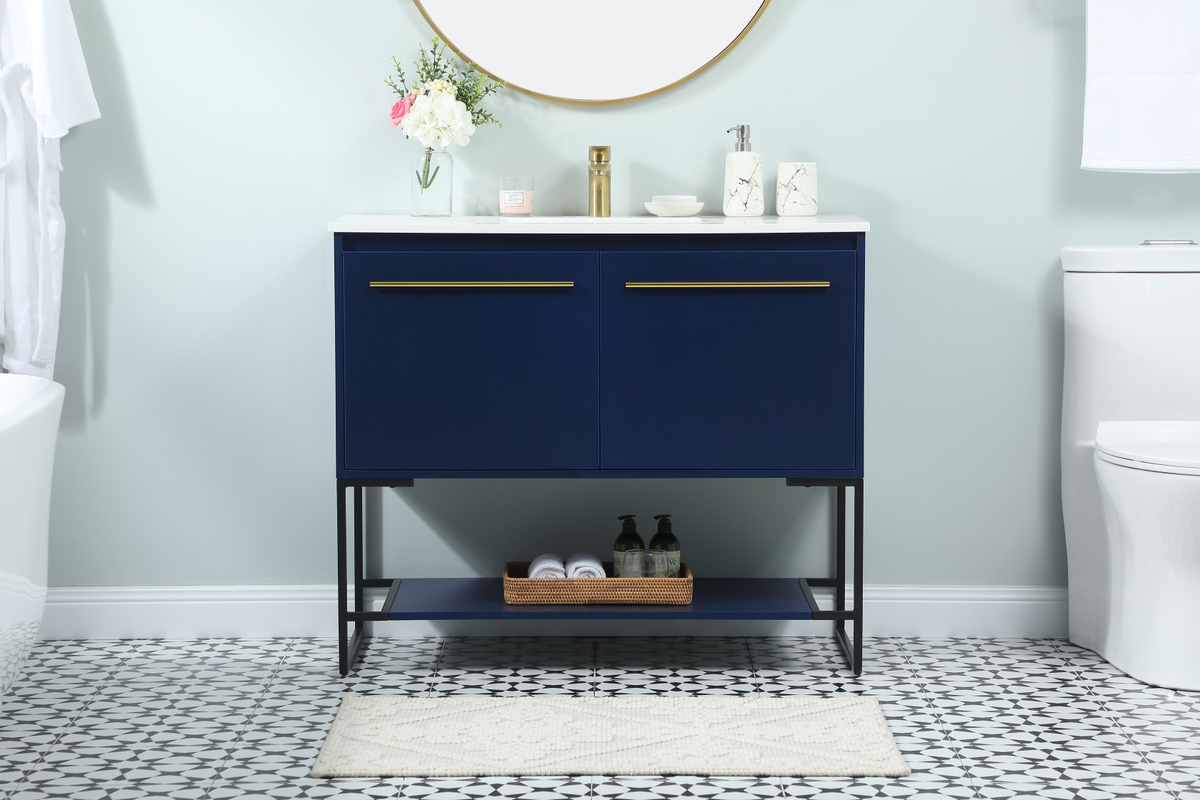 Live in modern comfort with this 40″ blue finish vanity. Dressed in a blue and sleek gold metal hardware, its contemporary style will have your bathroom or powder room elevated in industrial sophistication. The open shelf at the base and two doors reveal ample storage space for your bathroom essentials and miscellany. Clean lines create its own visual interest, adding trendy looks to your already chic room.