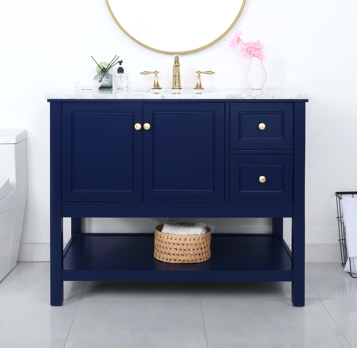 Create a refined and relaxing bath space with this contemporary design vanity, presenting its simplicity and clean straight lines in a minimalist appeal. The 42″ vanity provides ample storage within its 2 soft-close drawers, double door and a open shelf base, accentuated with gleaming gold hardware. Rounding out the design is a luxurious Itallian Carrara white marble counter top and a white porcelain under-mount oval sink.