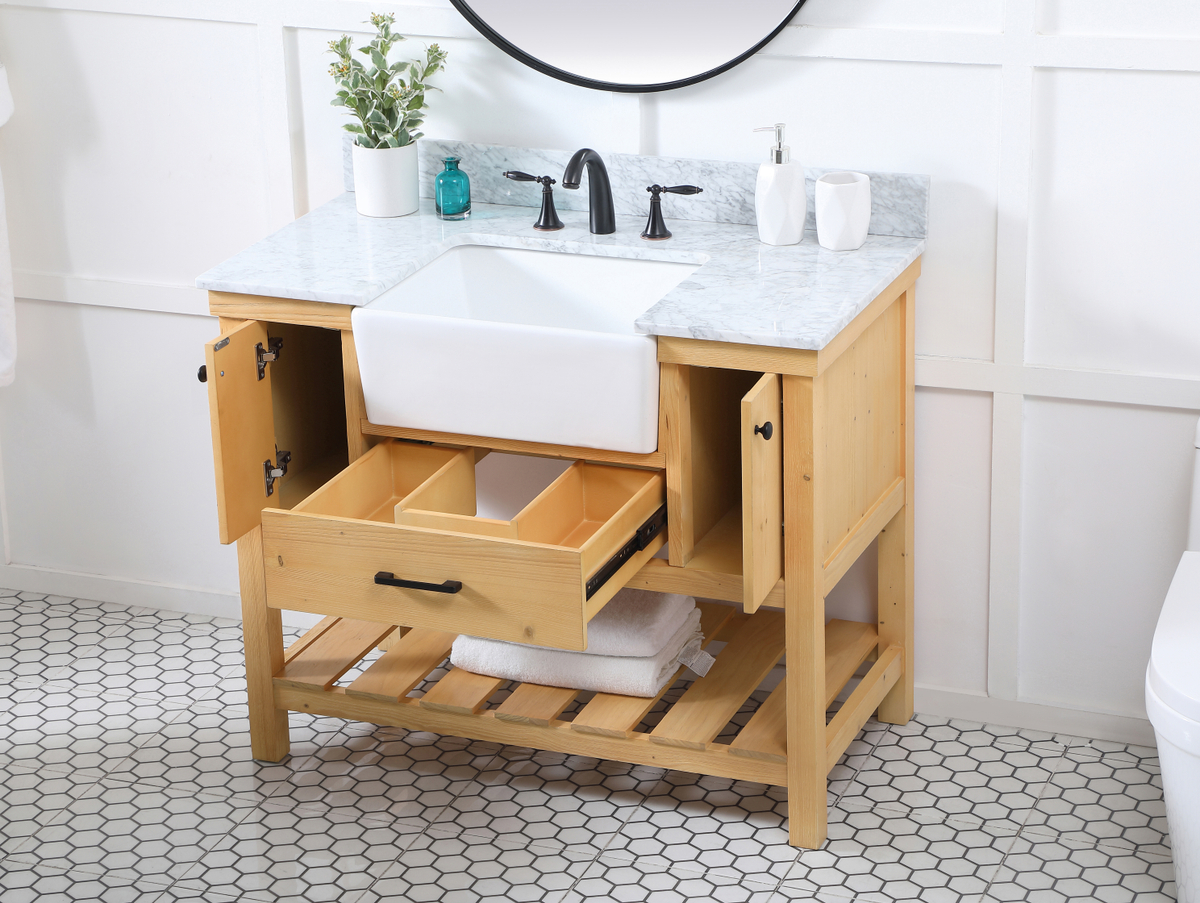 Make the most of your space with this farmhouse style bathroom vanity. Complements well with its beautiful finish, carrara white marble countertop, and the contemporary slender handle bar that sits on the functional drawers with soft closing mechanism, allowing you to store an assortment of bathroom essentials. The lower shelf makes it the perfect space to hold new towels for your guests. This stylish vanity ensures both form and function in your bathroom for you and your guests.