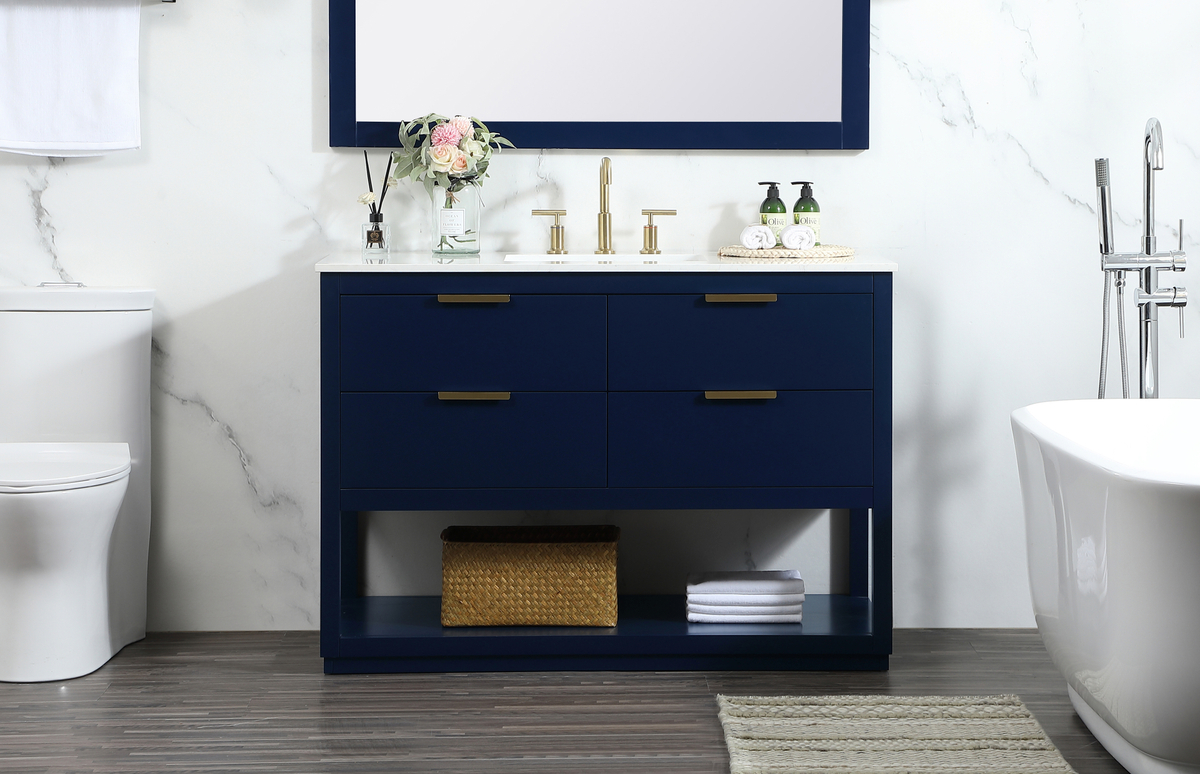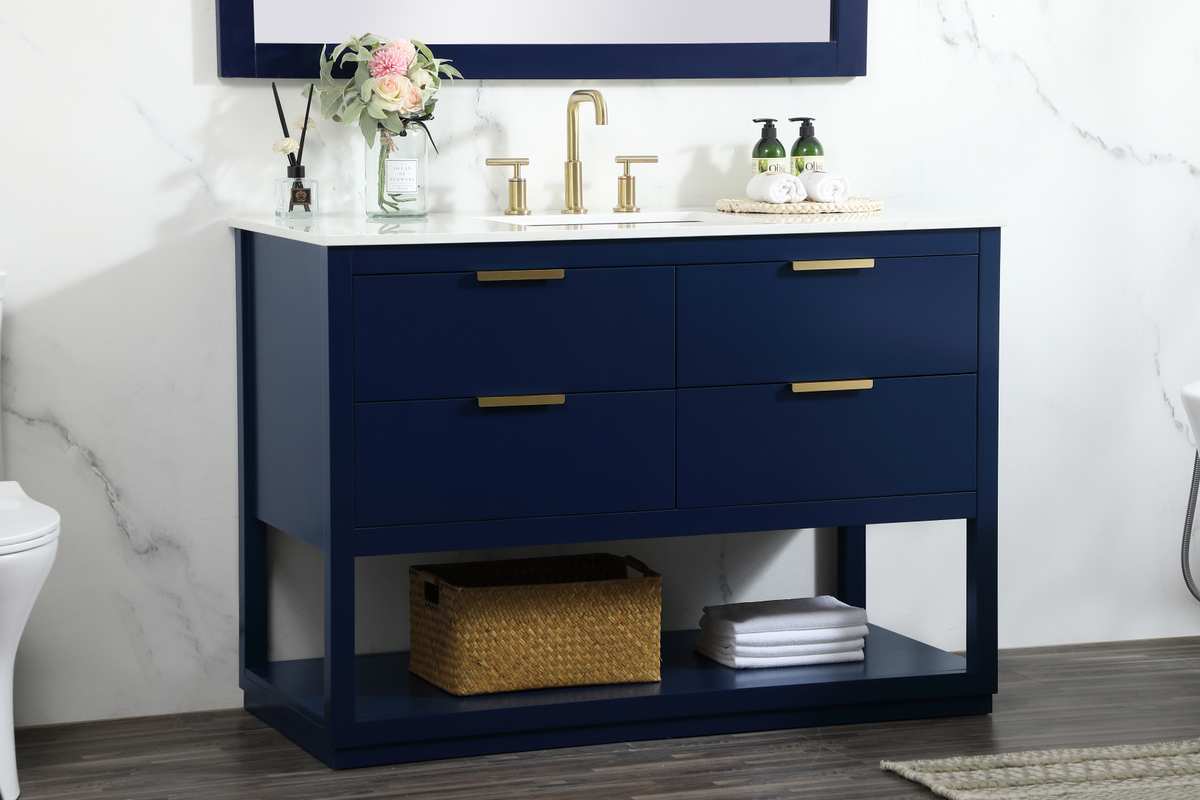 Live in modern comfort with this 48″ blue finish vanity. Dressed in a blue and sleek gold metal hardware, its contemporary style will have your bathroom or powder room elevated in modern sophistication. The open shelf at the base and four drawers reveal ample storage space for your bathroom essentials and miscellany. Clean lines create its own visual interest, adding trendy looks to your already chic room.