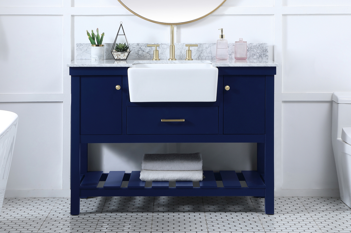 Make the most of your space with this farmhouse style bathroom vanity. Complements well with its beautiful finish, carrara white marble countertop, and the contemporary slender handle bar that sits on the functional drawers with soft closing mechanism, allowing you to store an assortment of bathroom essentials. The lower shelf makes it the perfect space to hold new towels for your guests. This stylish vanity ensures both form and function in your bathroom for you and your guests. Comes with a matching backsplash to complete the look and protects your wall.