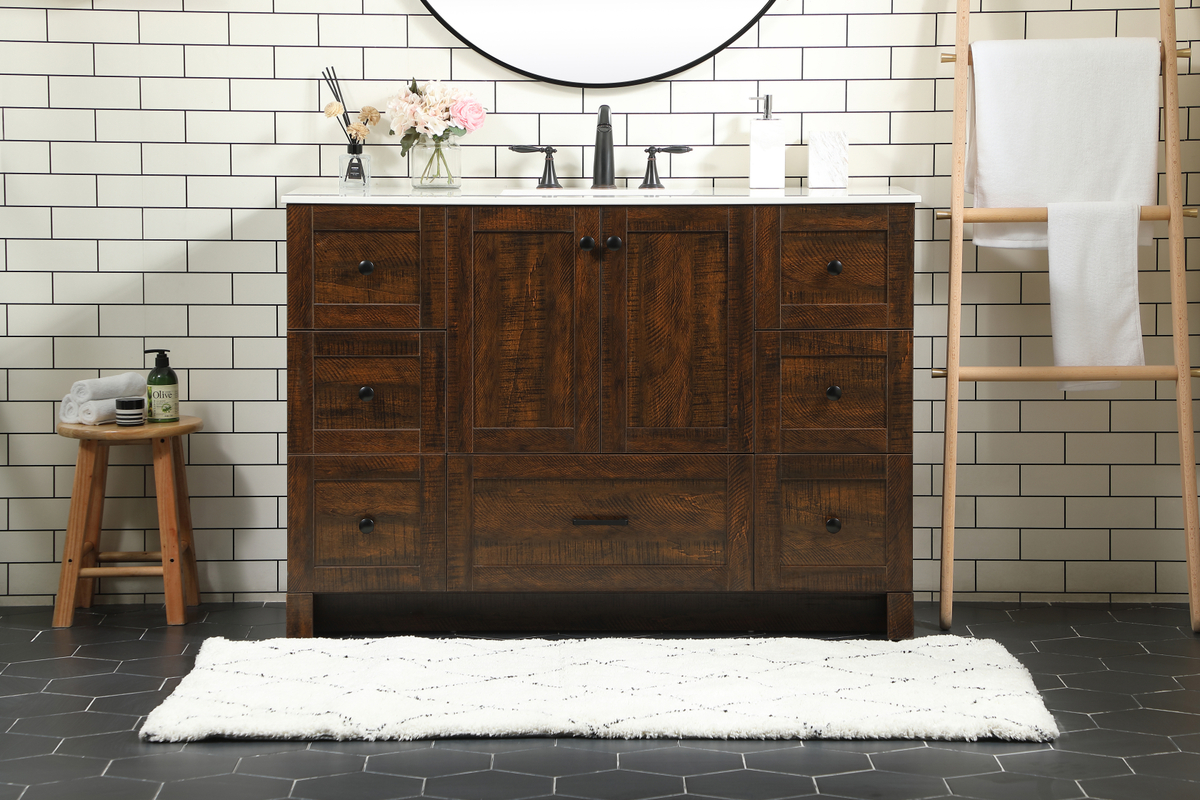 Delve into a world of minimalistic fashion and contemporary styling with this farmhouse 48″ vanity. The clean faux lines anchors the weathered design. Black handle adorns the two doors hiding the base of the integrated porcelain sink while the bottom drawer and side drawers allow you to store your bathroom necessities and toiletries. It is the perfect vanity for any bathroom, regardless of size.