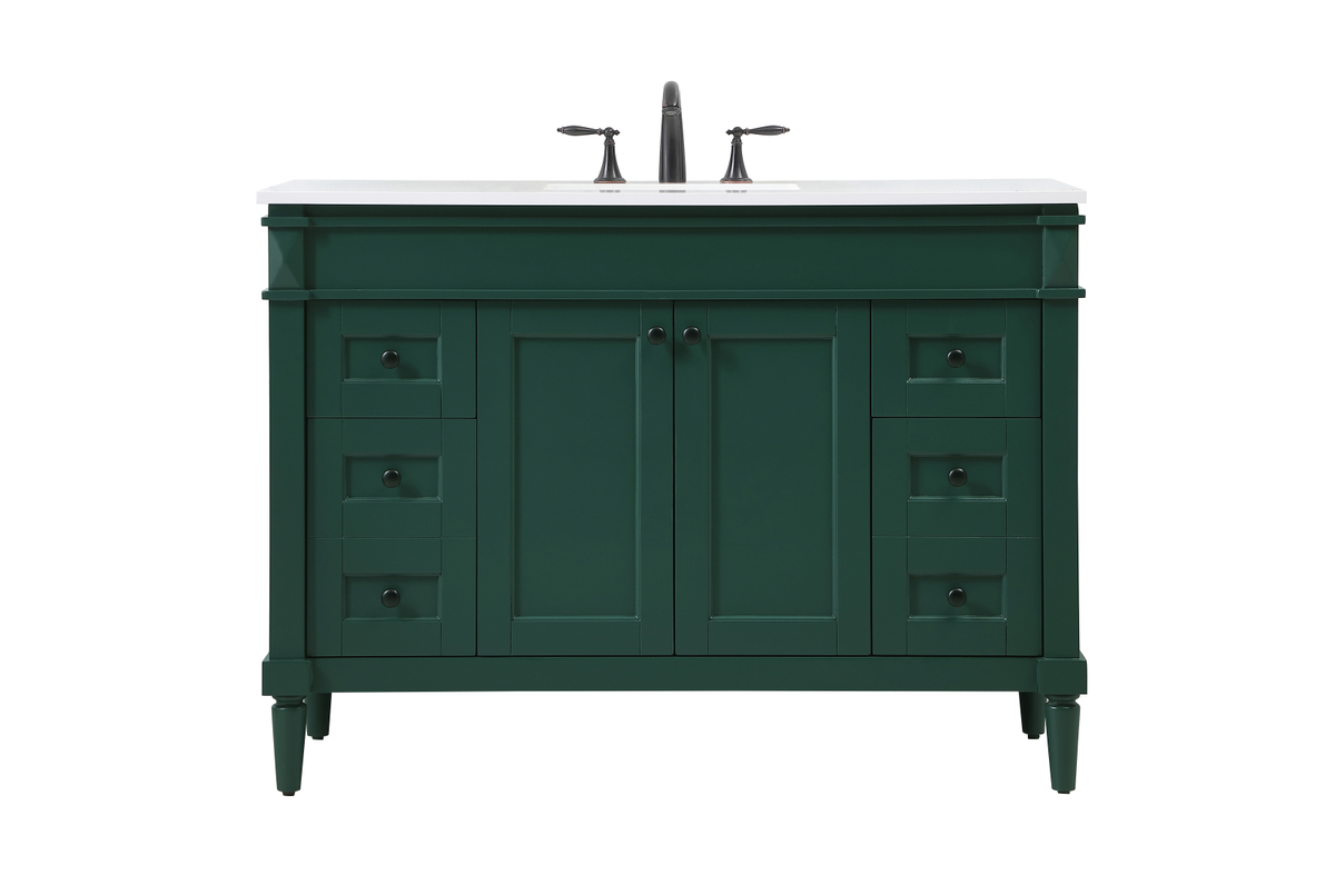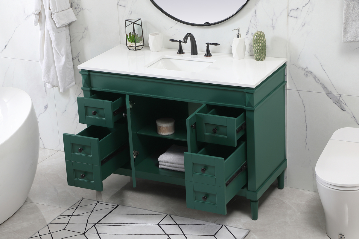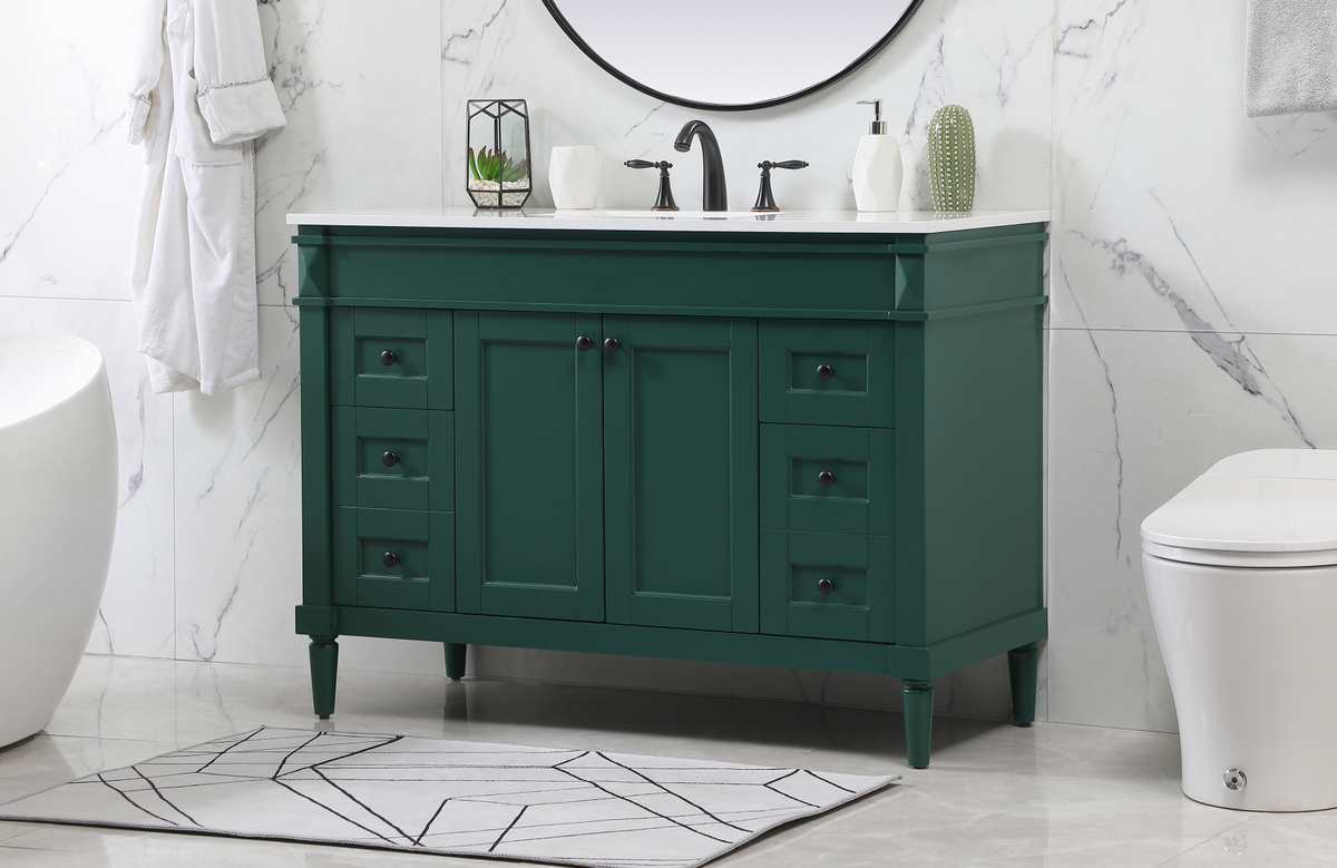 This transitional vanity is a beautiful piece of bathroom furniture will look amazing in your design scheme. The cabinet features a shaker style smooth door panel with simple round knobs and soft close hinges provide ample room for accessories. Packed with multiple side drawers with soft close glides for added comfort and full access to bath supplies. Convenient deep drawer stores all of your tall bath essentials. Constructed of engineered wood and solid wood legs with hand painted finish. The durable engineered marble countertop is a versatile material in an ivory white finish. Minor assembly of the legs needed to get this vanity up and running.