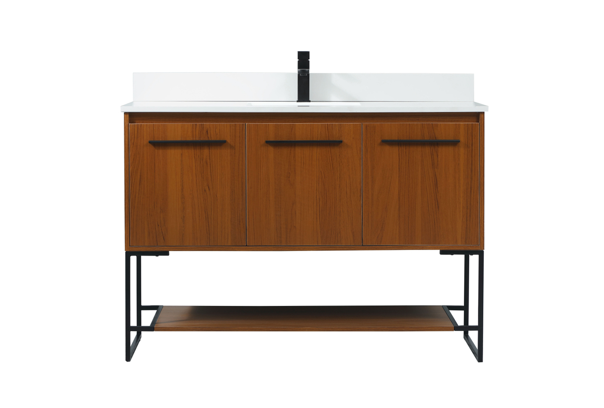 Live in modern comfort with this 48″ teak finish vanity. Dressed in a teak and sleek black metal hardware, its contemporary style will have your bathroom or powder room elevated in industrial sophistication. The open shelf at the base and three doors reveal ample storage space for your bathroom essentials and miscellany. Clean lines create its own visual interest, adding trendy looks to your already chic room. Comes with a matching backsplash to complete the look and protects your wall.