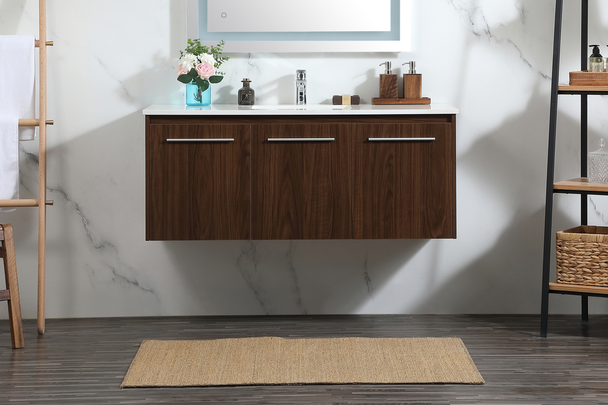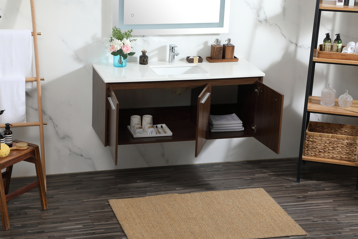 Save space and make your bathroom appear bigger with this floating vanity that comes in several finishes. Its minimal design will have you in awe, while its clean lines will leave your room feeling fresh and uncluttered. The Single cabinet opens with soft closing doors that allows for storage to place extra towels or various other essentials. Its low maintenance and durable engineered marble top will surely last through many washes.