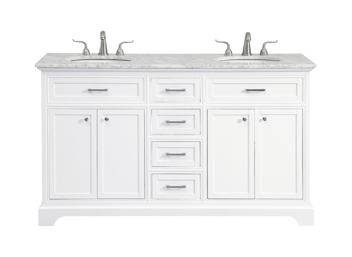 From its Italian Carrara white marble top to its contemporary-styled hand painted white cabinet, this member of our “Americana” vanity collection is sure to enhance either your home or office bathroom. Beneath its lustrous, natural marble top and 2 oval, white porcelain under mount sink, is a cabinet with 4 handsome center drawers and s set of doors with a Single shelf each for all your bathroom essentials, highlighted with recessed panel doors, brushed steel bar handle and knobs, stands on strong solid pedestal feet. A wonderful balance of simplicity and practical function! Measurements: W60”xD21.5”xH35”