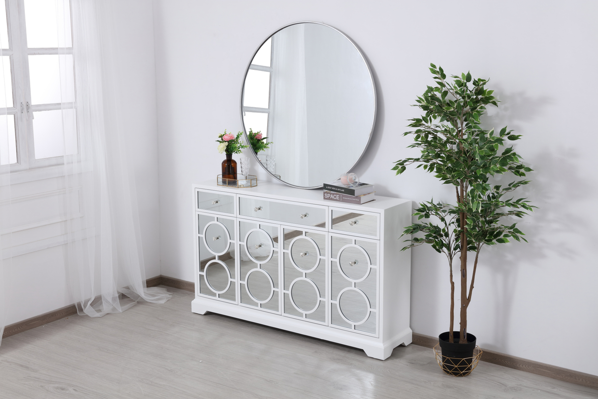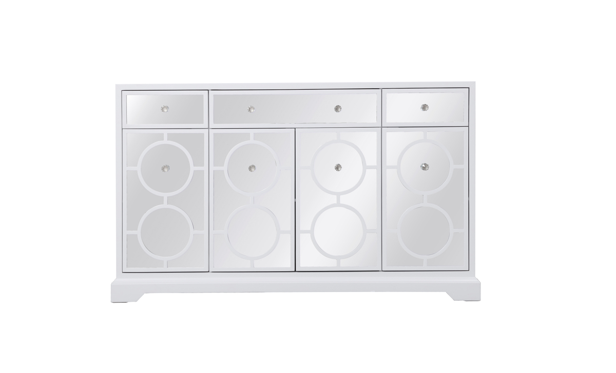 In bold elegance, measuring W60xD14xH36, this transitional beauty can decorate any narrow hallway or dining room or living room and still yield plenty of storage space. With the gleaming beveled mirror surfaces and white body, it opens up the visual space in the room while imbuing it with glamour. The crystal door knobs exude sheer elegance. Features 3 drawers and 4 doors in an infinity circle overlay design.