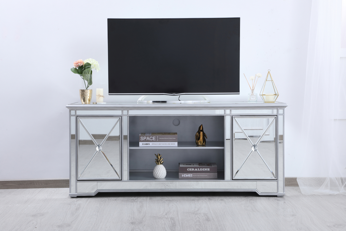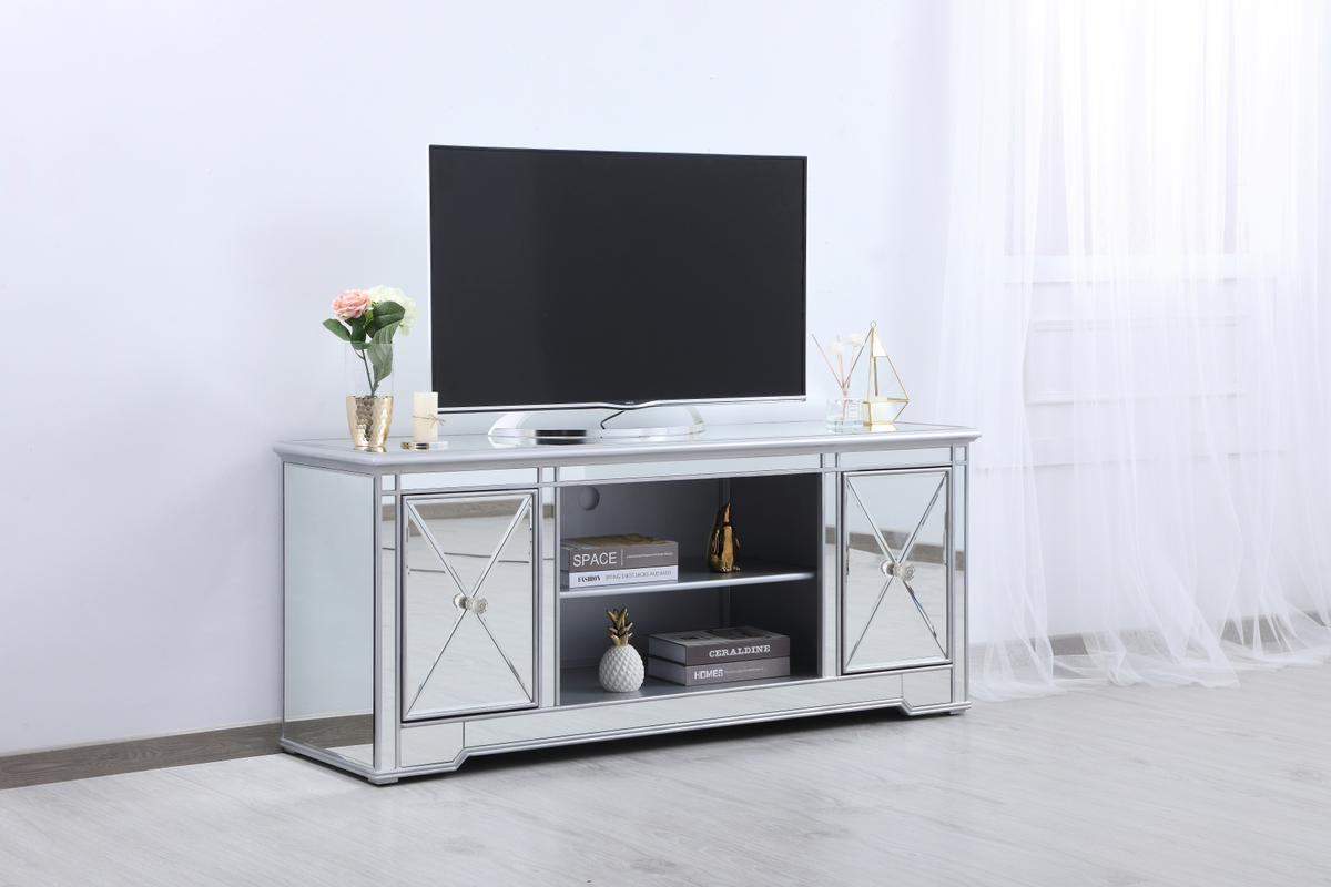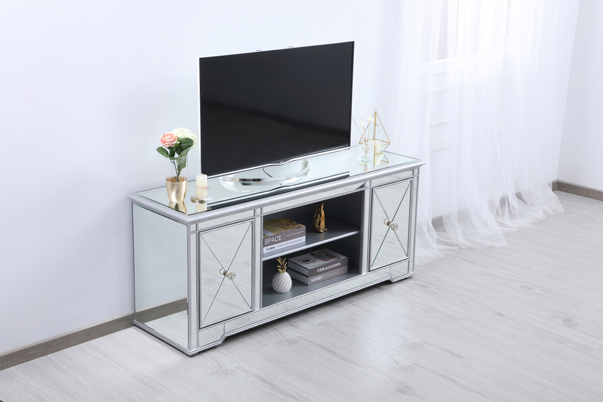 Sleek and vibrant, this classy media cabinet will make a striking statement in any room can showcase up to a 60″ flat screen TV at a perfect height. Featuring gleaming criss-cross style mirror panel and hand-rubbed silver finish, brushed steel knobs. Functional and chic, with 2 soft-closing side doors, center opening and shelvings, it provides plenty of storage for your equipment, games, and books.