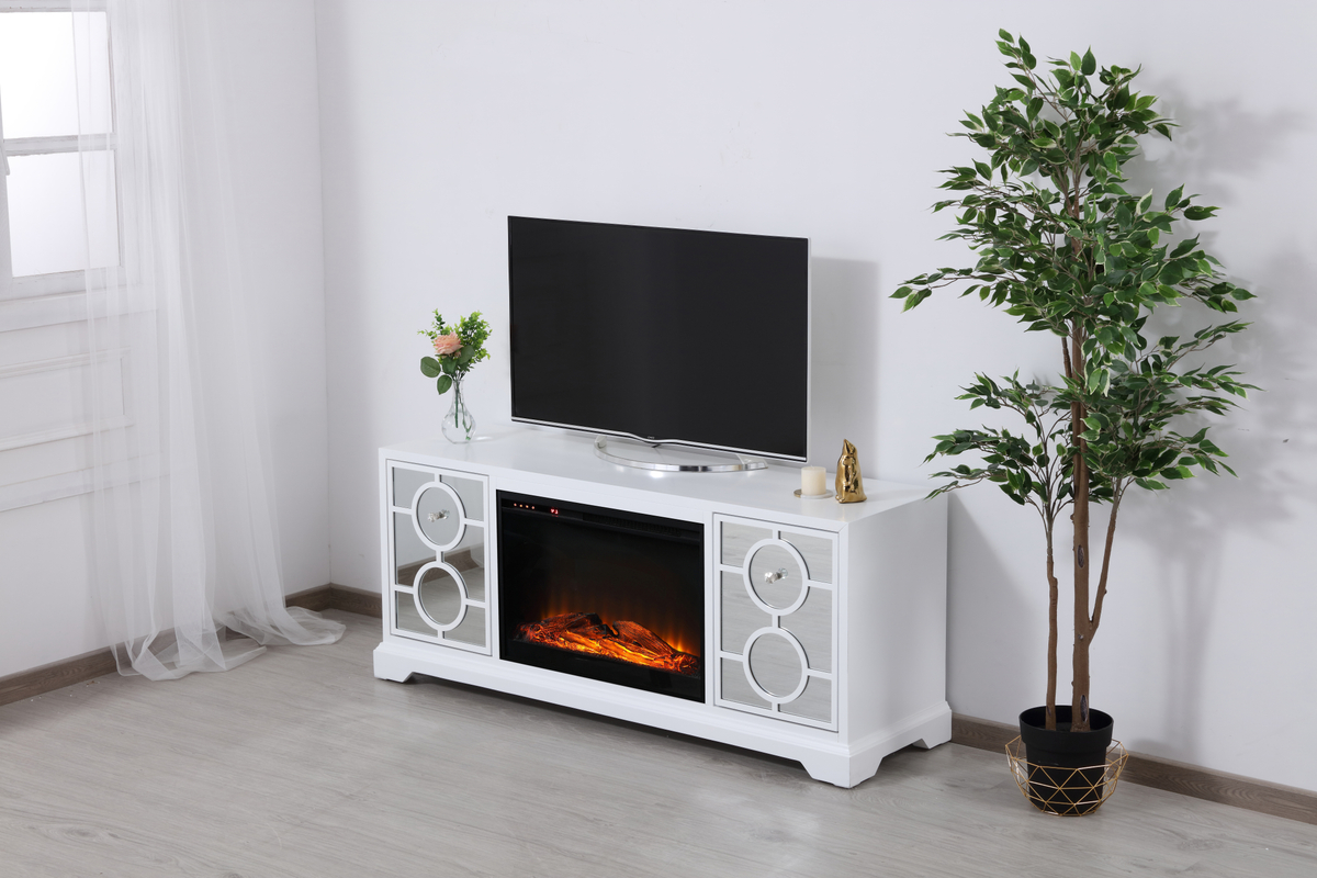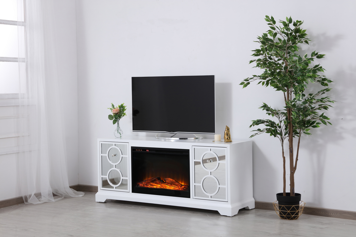 60 in. mirrored TV stand with wood fireplace insert in white