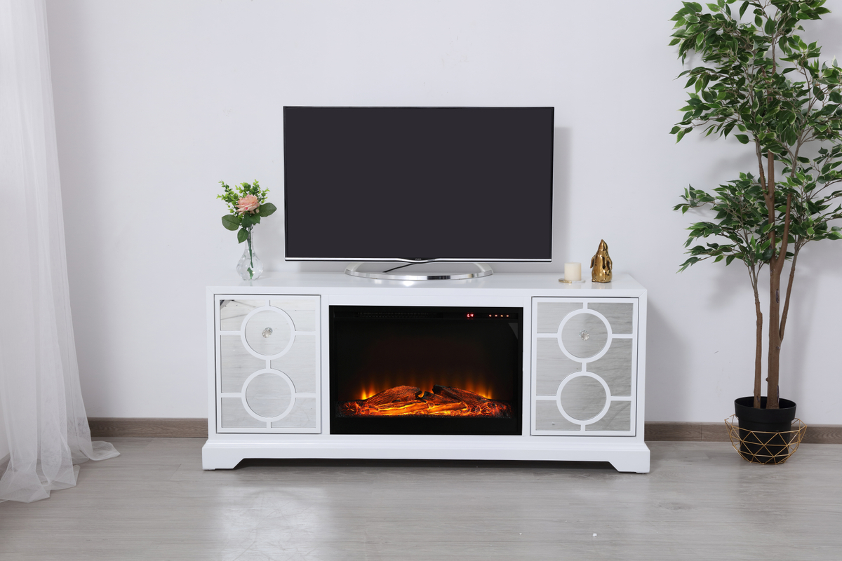 Sleek and vibrant, this transitional media fireplace cabinet combo will make a striking statement in any room can showcase up to a 60″ flat screen TV at a perfect height. Featuring top-quality mirror panel with circle overlay and hand-painted in a semi-gloss white finish, accentuated with crystal square knobs. Functional and chic, it features 2 side doors. This includes the electric wood log fireplace insert that is easy to install into the cabinet. Set the mood with adjustable temperature and lighting settings.