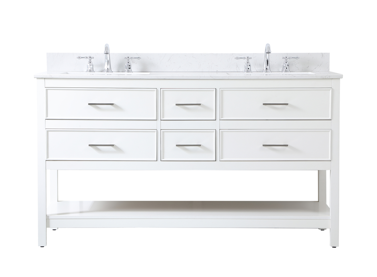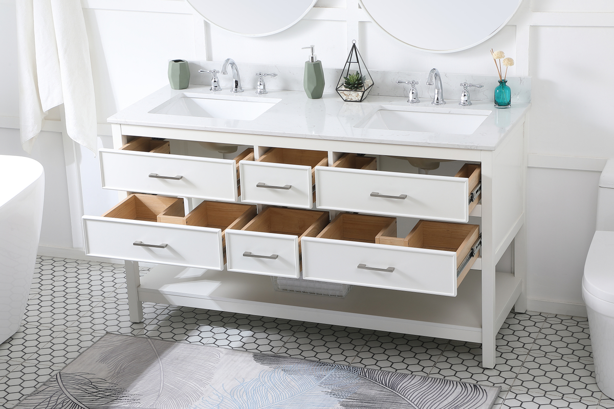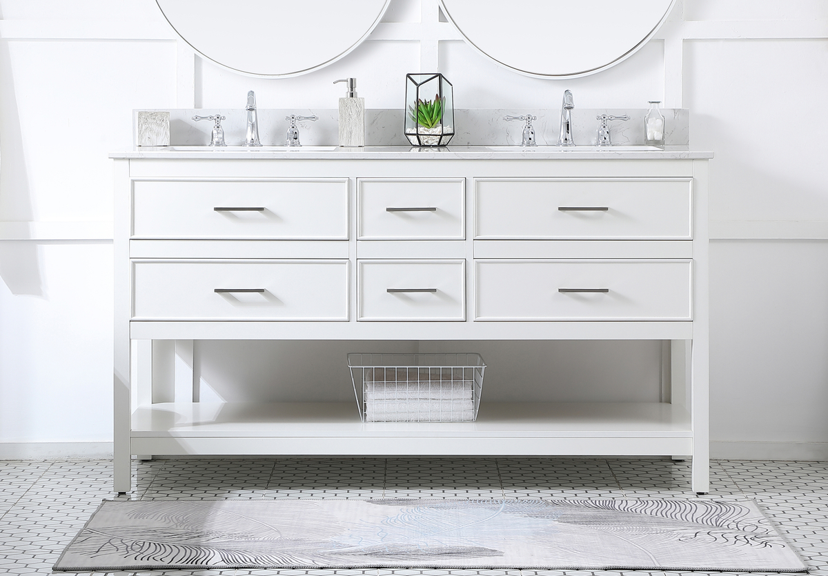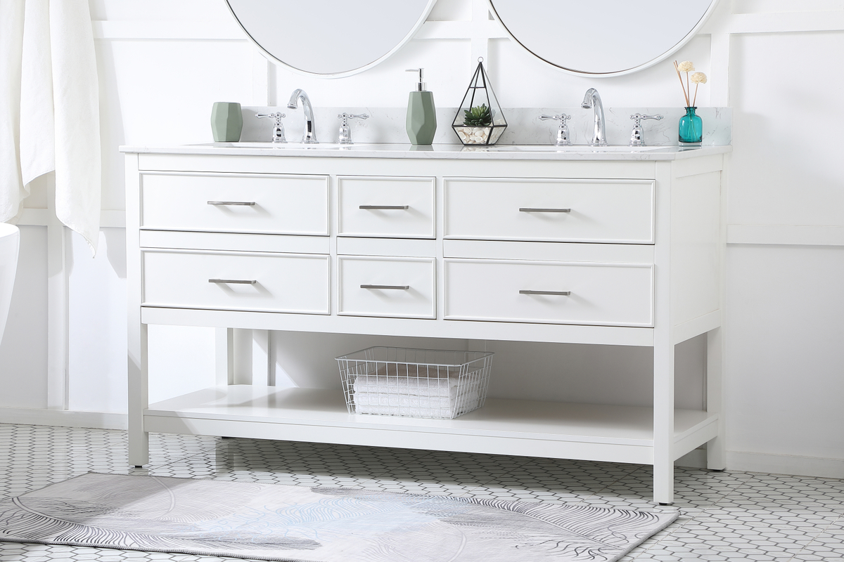60 inch double bathroom vanity in white with backsplash
