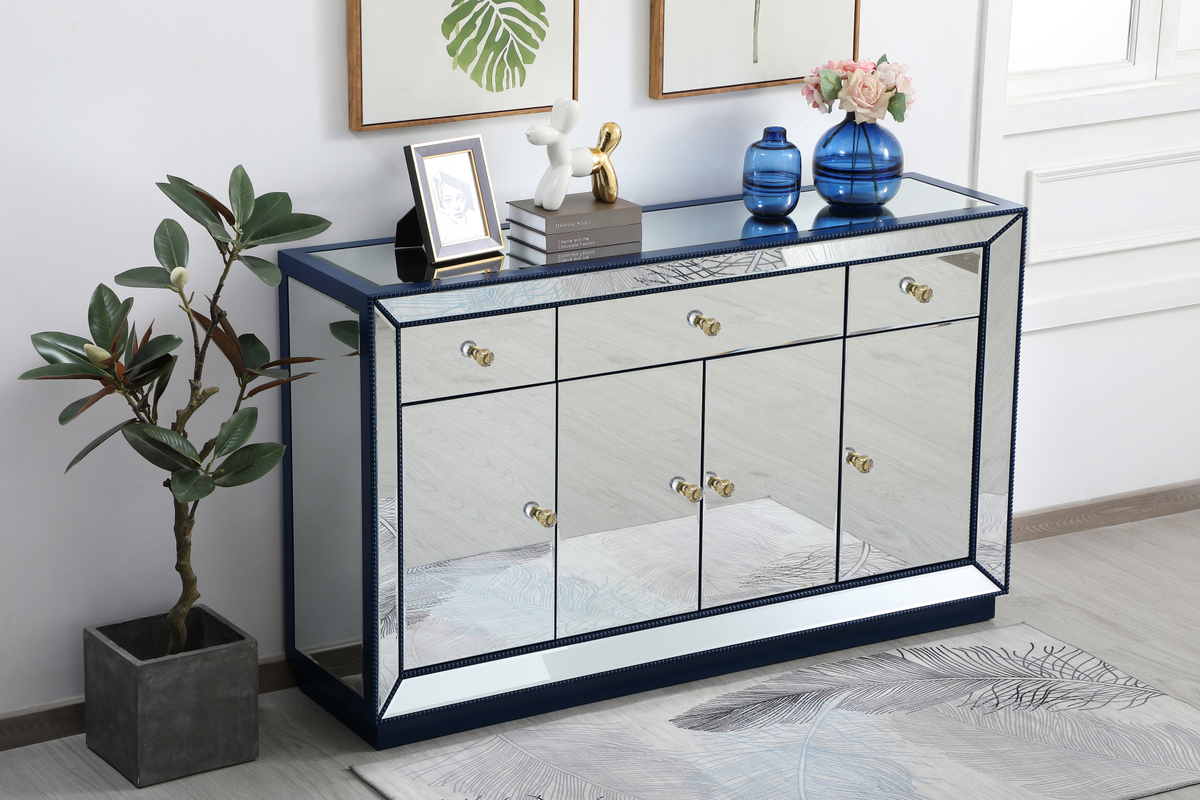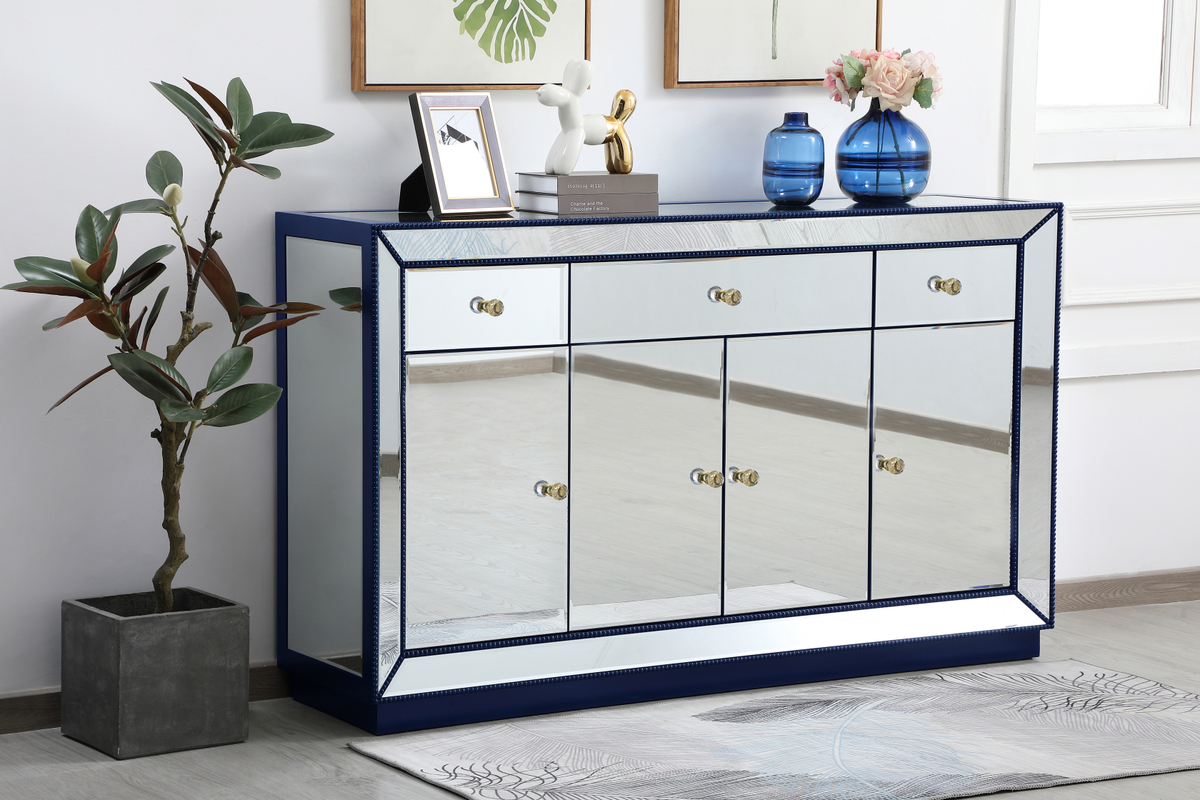 Make a striking statement with this gleaming mirrored credenza. Its contemporary style is defined by the alternating panels of polished beveled mirror panels. Its alternating panels that wrap around the entire cabinet creates an amusing design that everyone will enjoy and marvel at. Place this credenza in your home and adorn it with your favorite objectscaptivating art pieces, beautiful floral arrangements, or even personal treasures like family portraits. Ships fully assembled.