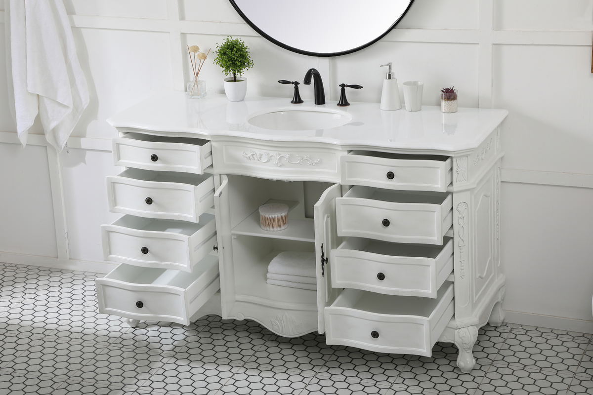 This superb balance of timeless tradition and opulent beauty in a engineered marble-topped vanity will certainly enhance the aesthetics of any home or office bathroom! Featuring an ivory white durable engineered marble countertop complimenting the hand painted cabinet with a delicate carved floral design, stands on stylishly carved solid wood French scroll feet. Don’t let the design fool you, the engineered marble countertop and porcelain undermount sink allows for space to get ready, while the antique bronze hardware allows you to discover storage spaces with ease. You and your guests will marvel at this vanity that will both store away your bathroom essentials and enhance the aesthetics of your room.