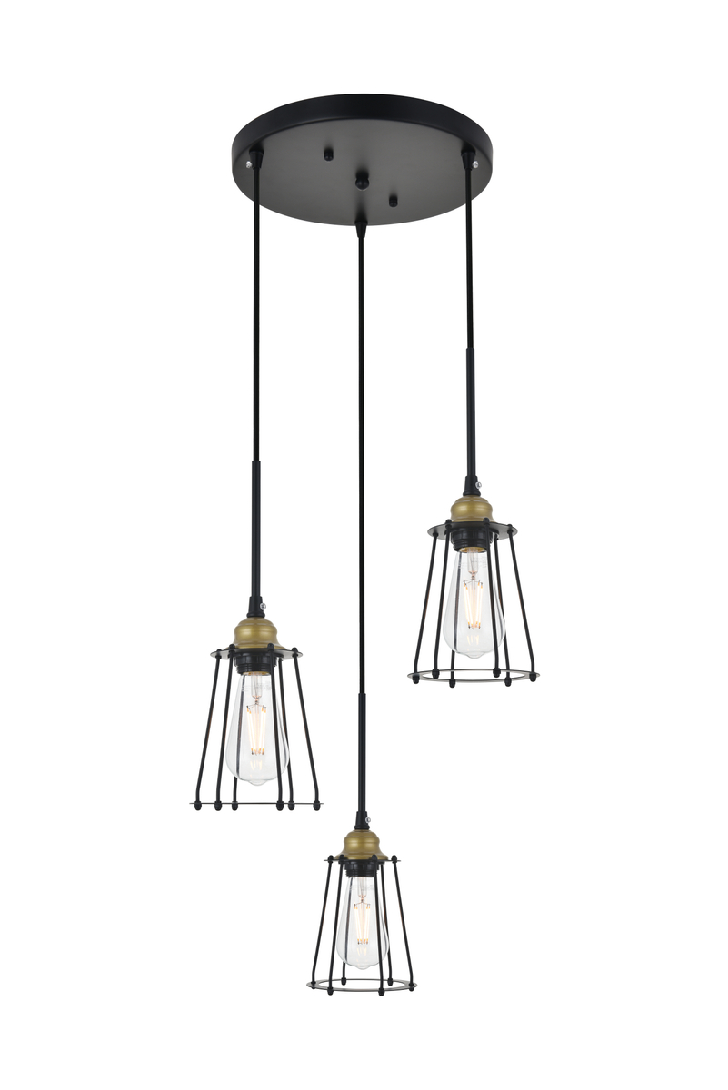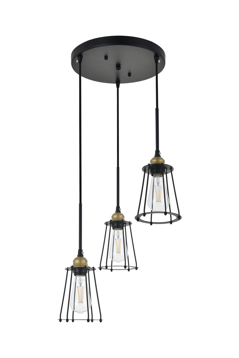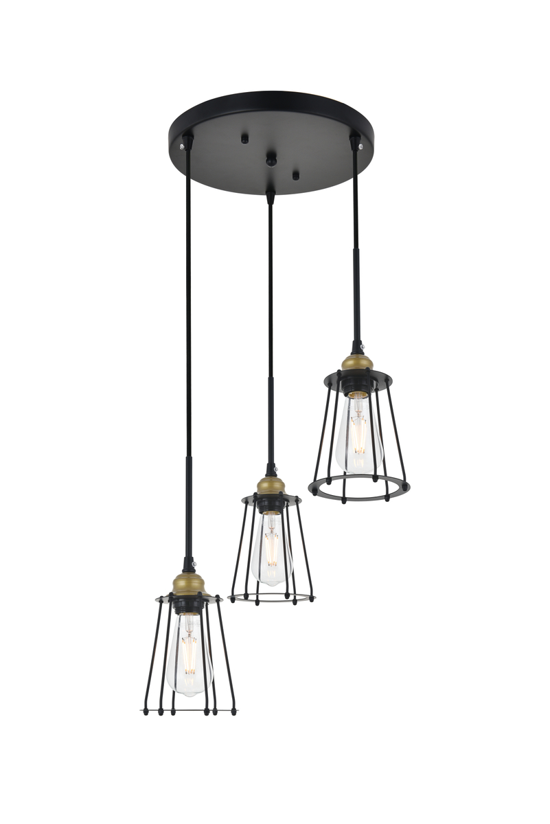 Two-toned brass an black finish 3-light pendant light with a contemporary open cylinder shade suspended from a circular canopy
