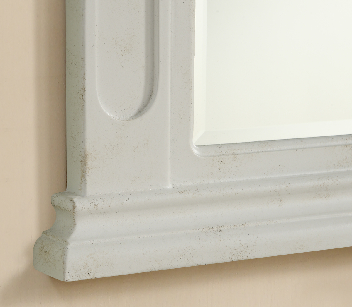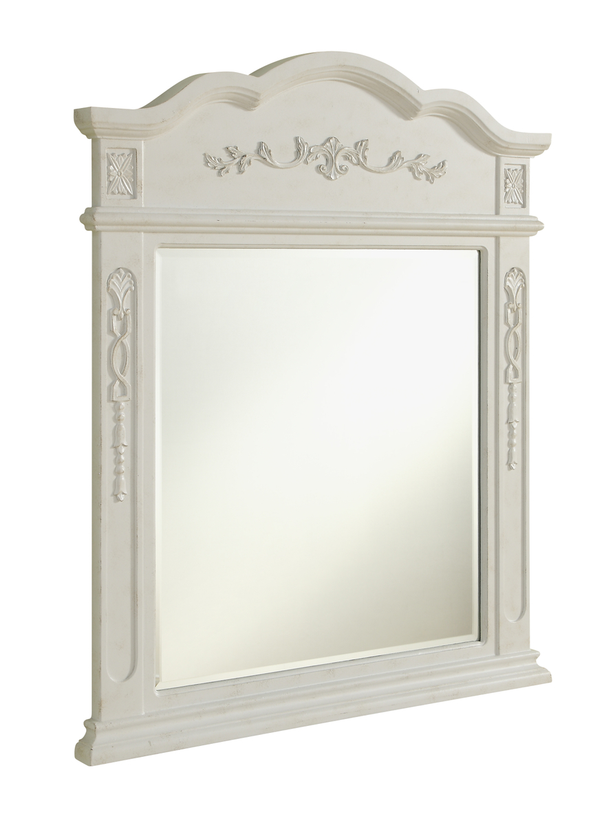 Elegant and refined, this traditionally designed, floral carved mirror frame is hand painted in an antique white finish with a clear beveled mirrora splendid match for the opulent Danville vanity. Measurements: W32xH38