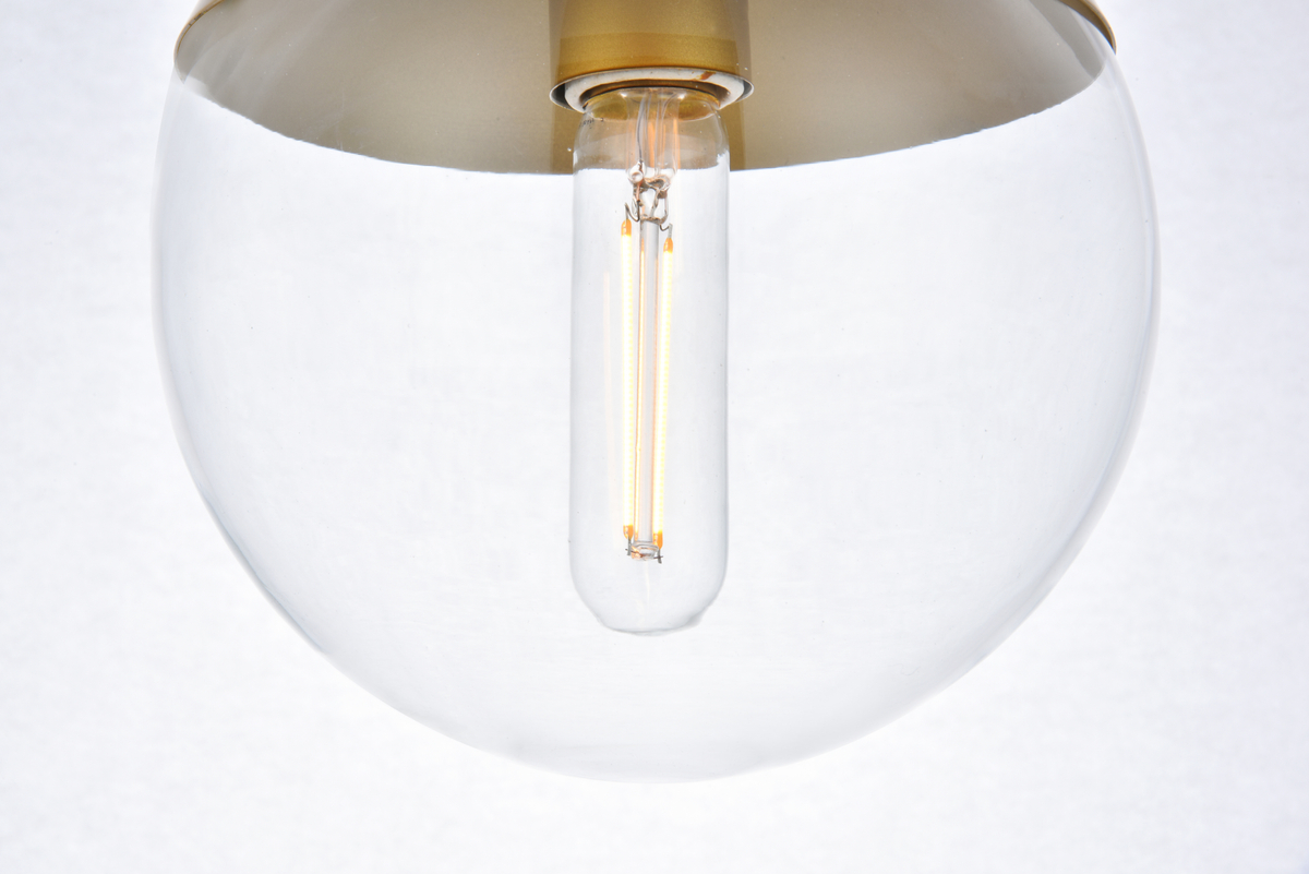 Pendant lamp features a brass and clear glass.
