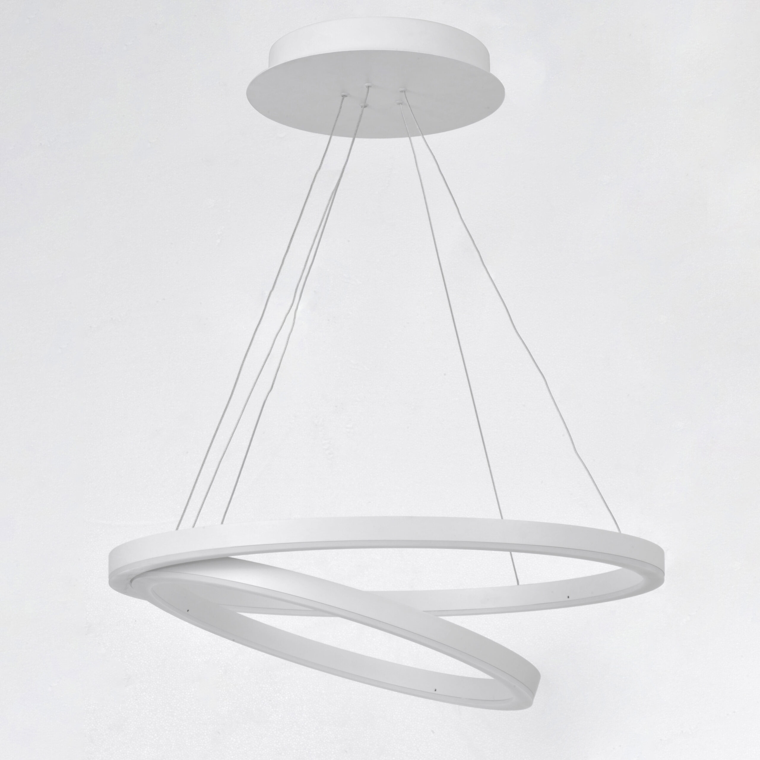 Matte White rings suspend in a unique fashion as if relying on each other for support. A continuous band of LED evenly spread generous amounts of dimmable light into the space. Ceiling fixtures can also double as wall mounts.