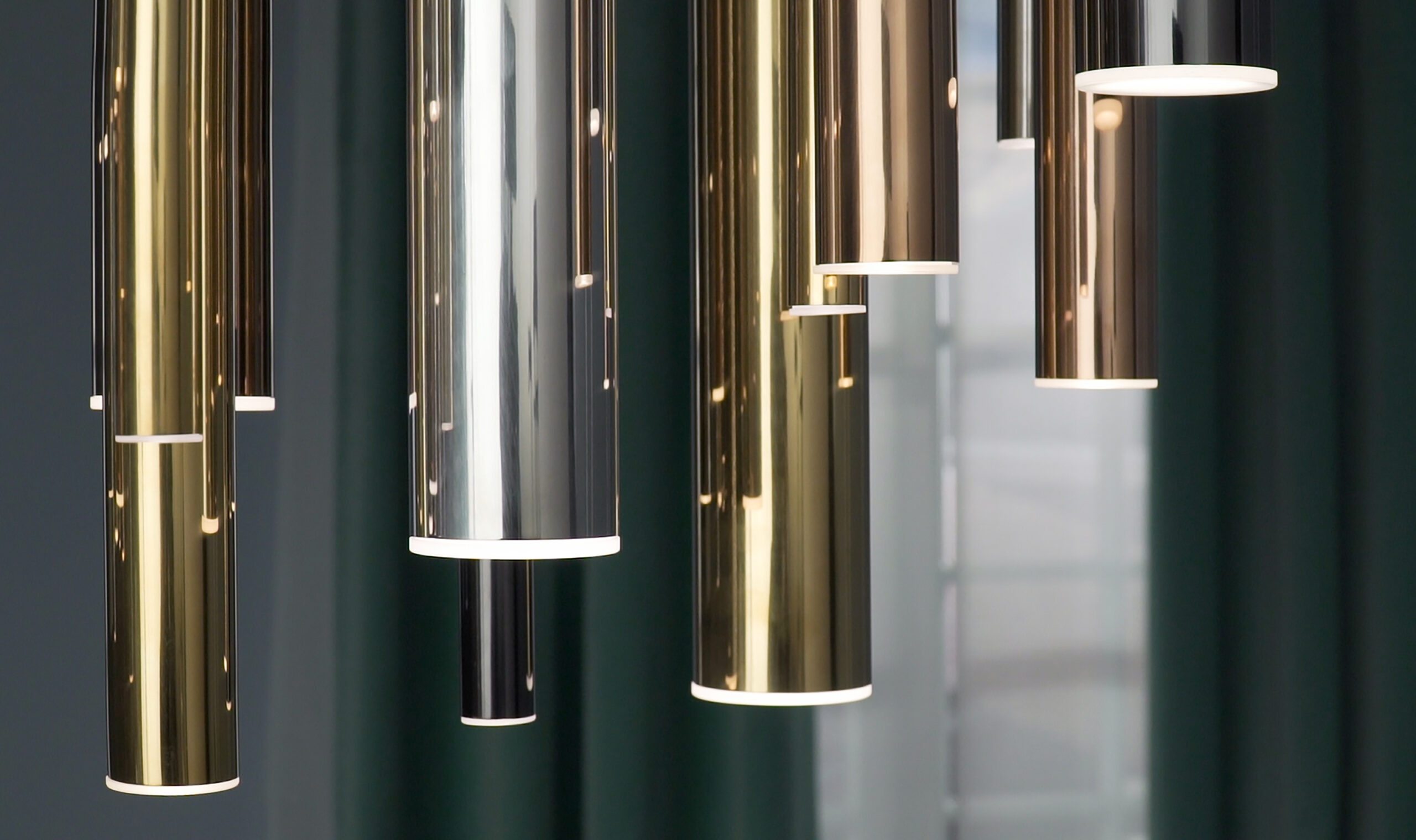Elongated metal tubes in a variety of finishes from Rose Gold to Polished Chrome suspend from pans to create impressive sculptural statements. Each tube encase a replaceable integrated LED module while many of the ceiling pans house additional LED spots to highlight the beautiful high gloss finishes as well as additional down light.
