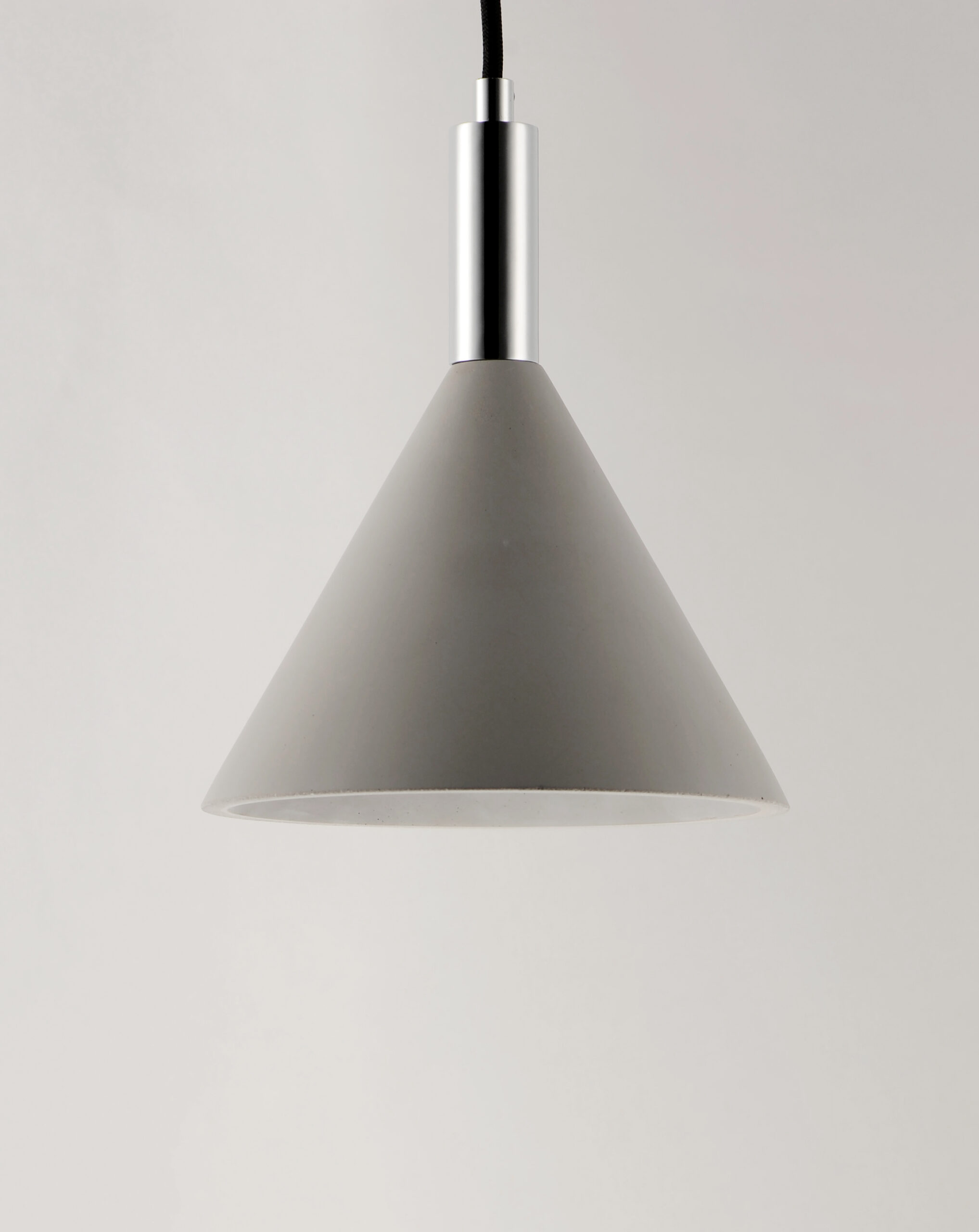 Heavy weight cone shaped pendants of White gypsum or Grey concrete, both with Polished Chrome accents, project ample light downward by means of the LED GU10 lamps provided.