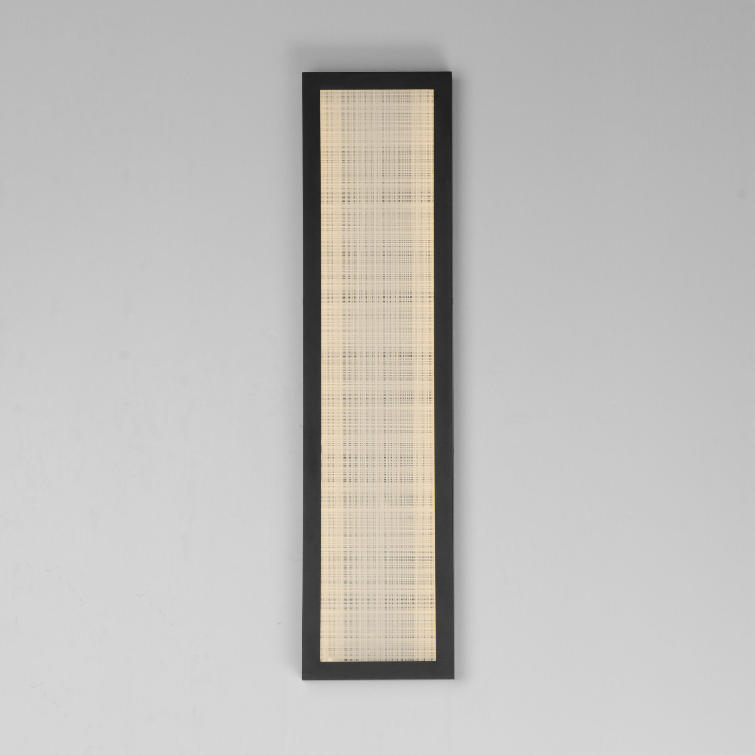 An internally illuminated shadow box is encased in glass with a tartan plaid pattern engraved to mimic linen. The back plate features a polished stainless steel plate adding an almost infinite dimension to the pattern. Constructed of aluminum in Matte Black finish and 304 grade Stainless Steel, the product is also suitable for installations outdoors.