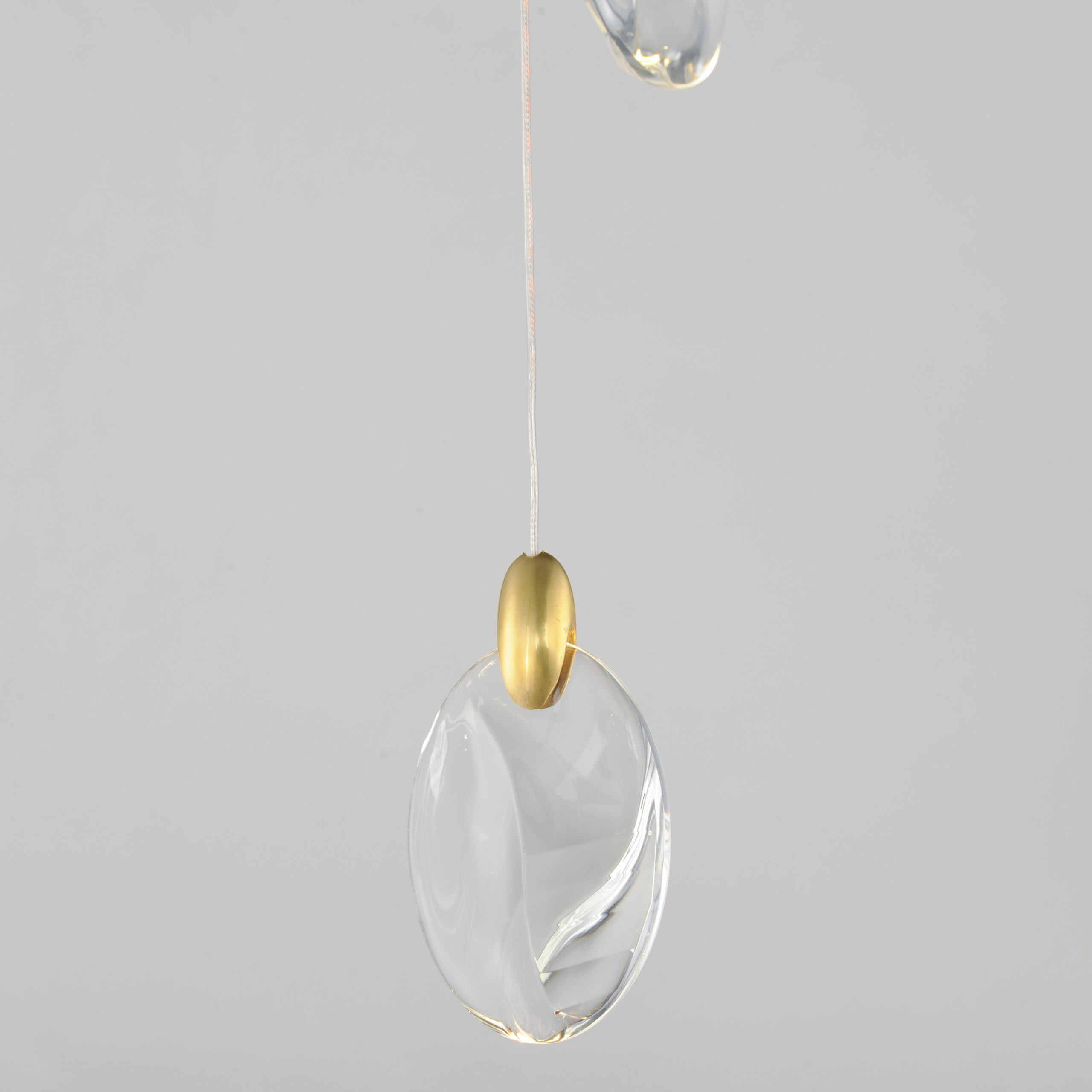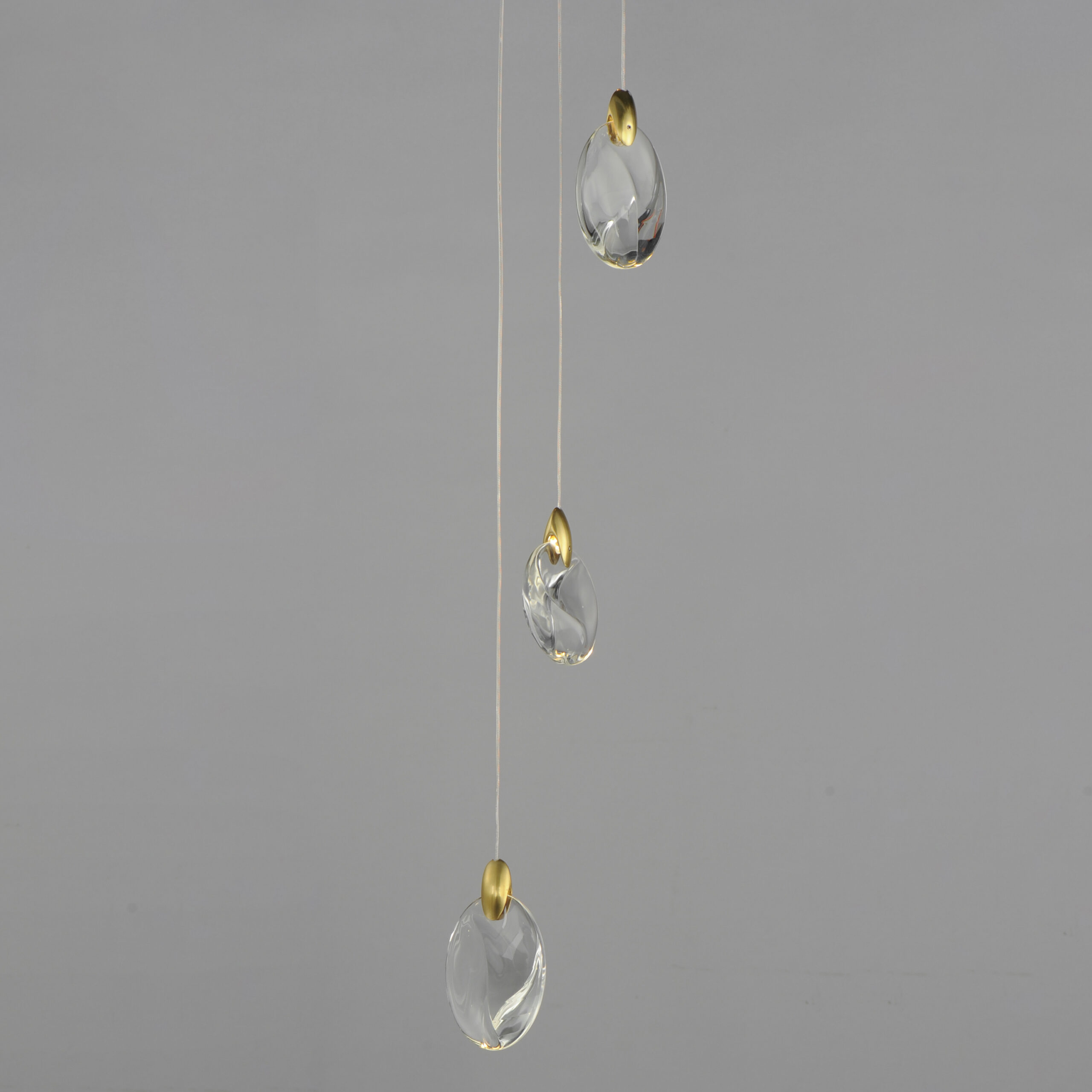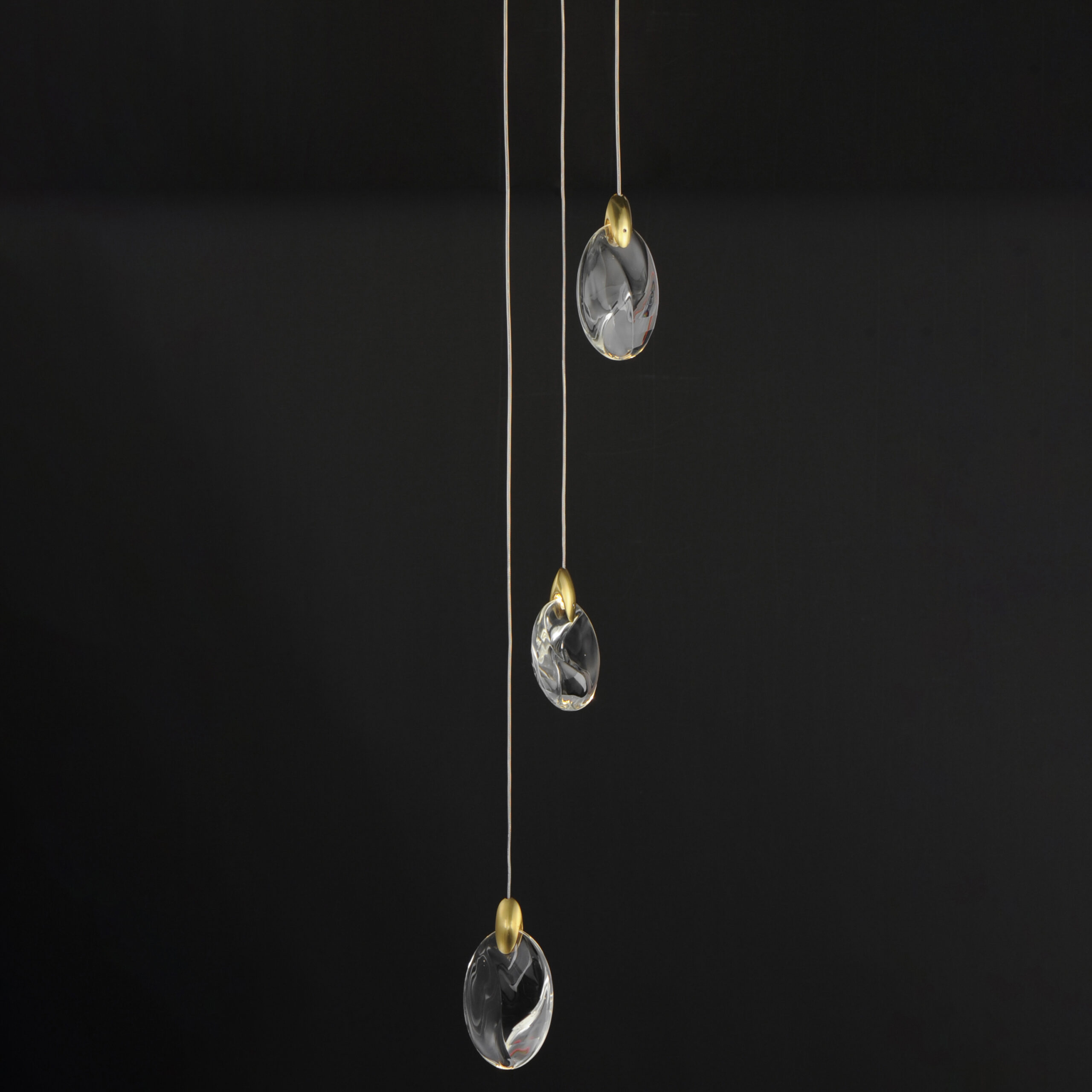 As if naturally formed from the ebbing shores of a riverbed, smooth and irregularly shaped crystal pebbles are suspended by cast metal clasps in a Polished Gold finish. Discreetly illuminated by concealed LED light sources within the clasps, additional downlight originates from LED GU10 lamps housed in a Matte Black canopy adding to the refracting iridescent shimmer on the crystal surface below. Available in multiple configurations of pendants as well as sconce options.