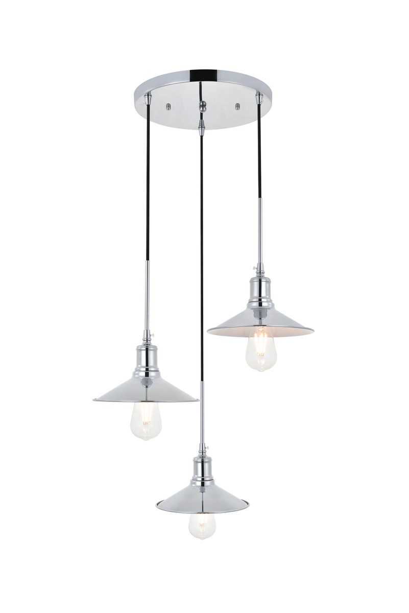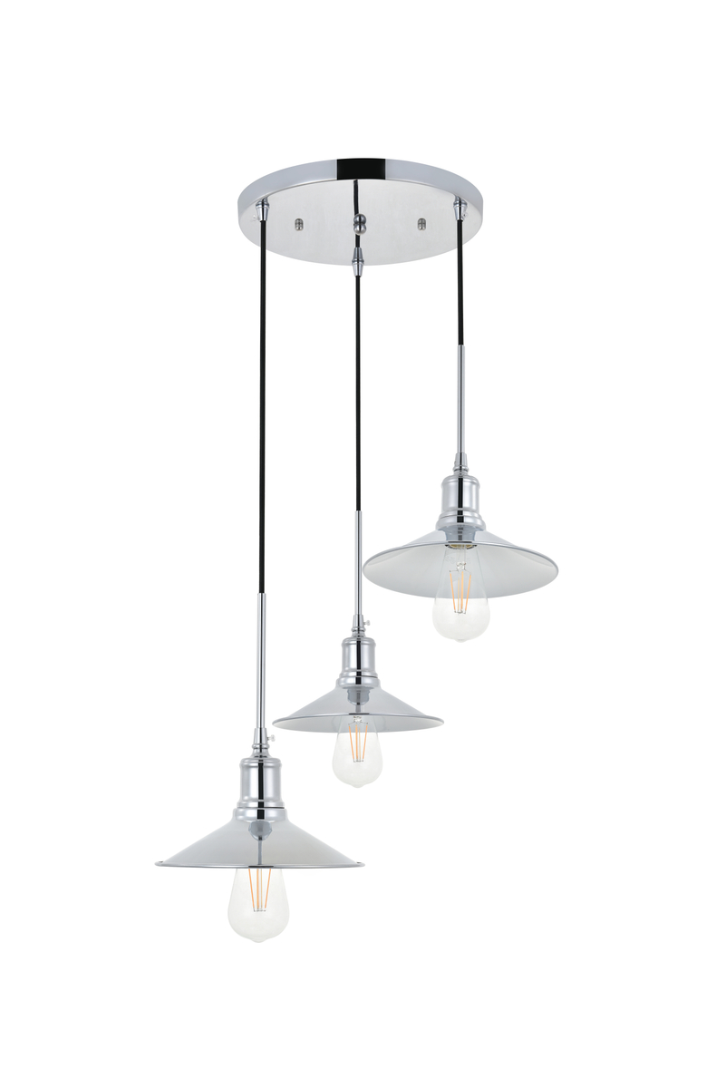 Chrome finish 3-light pendant light with dome shaped shade suspended from a circular canopy