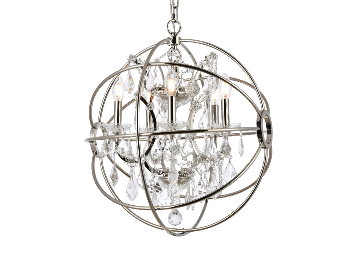 Royal-cut clear crystals and five candelabras beautifully complement the polished-nickel finish