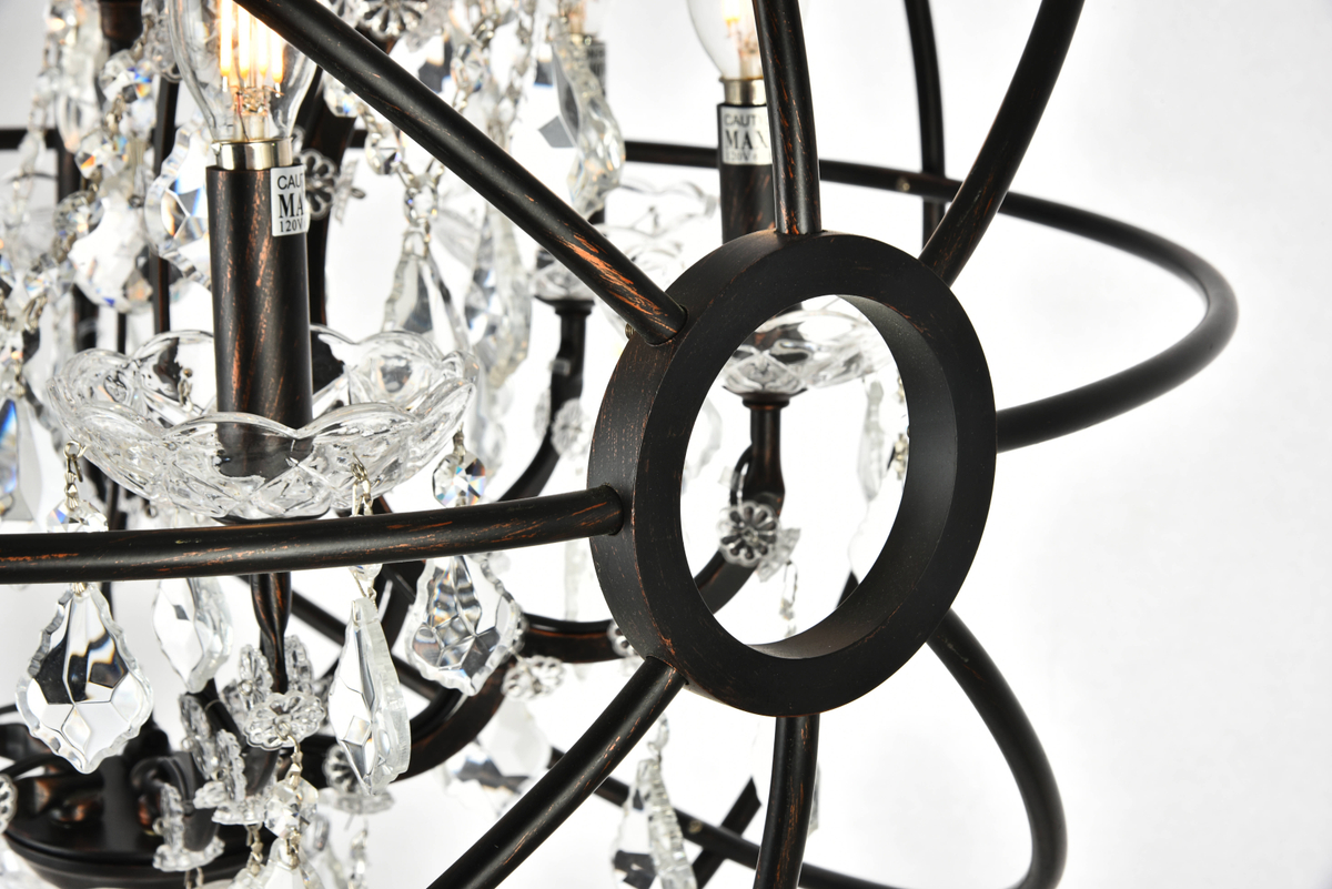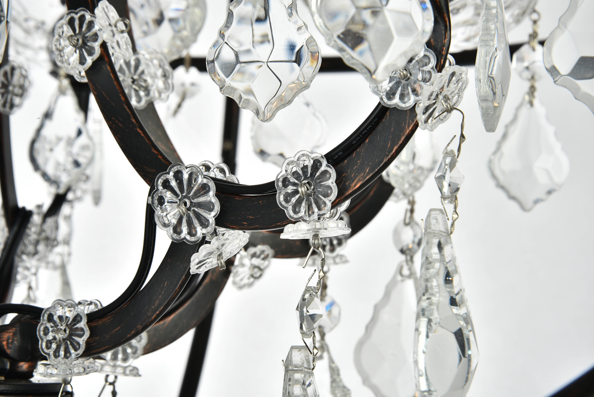 Royal-cut clear crystals and six candelabras create a dramatic contrast with the dark-bronze finish