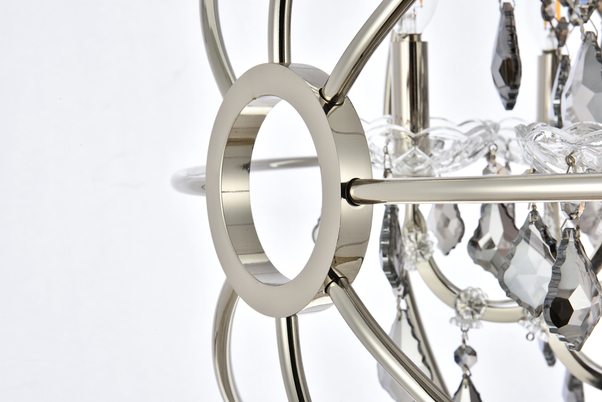 Royal-cut Silver-shade crystals and six candelabras beautifully complement the polished-nickel finish