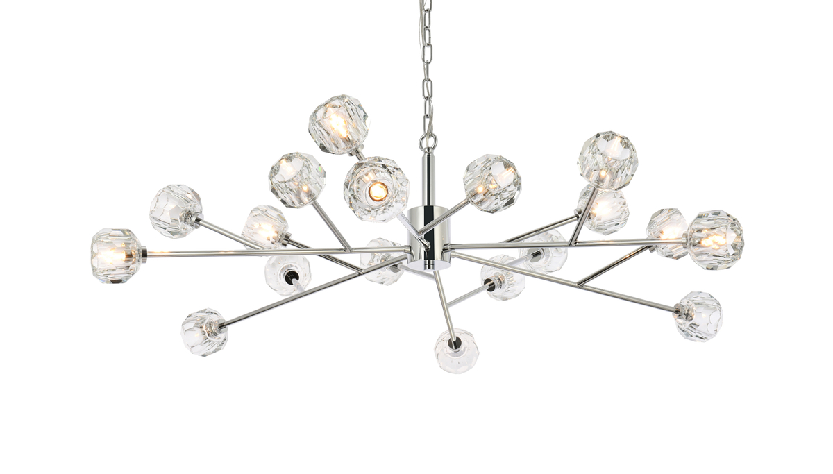 Crafted from iron metal and crystal, it features a round ceiling canopy, a 60 inch hanging chain, and arms extended with a solid K9 crystal ball from rods at all angles for a modern and linear look. Each 20W G9 bulb ( not included) is diffused by a faceted clear crystal ball giving the fixture a touch of industrial and glam inspiration. This work of art will add an artful focal point to your entryway, dining room, kitchen, or office. Evoking a sophisticated and timeless aesthetic to any space and will be an instant conversation started with its finely faceted crystal sphere which is polished by hand to reflect and refract light. Available in three different finishes in gold, chrome, and black.
