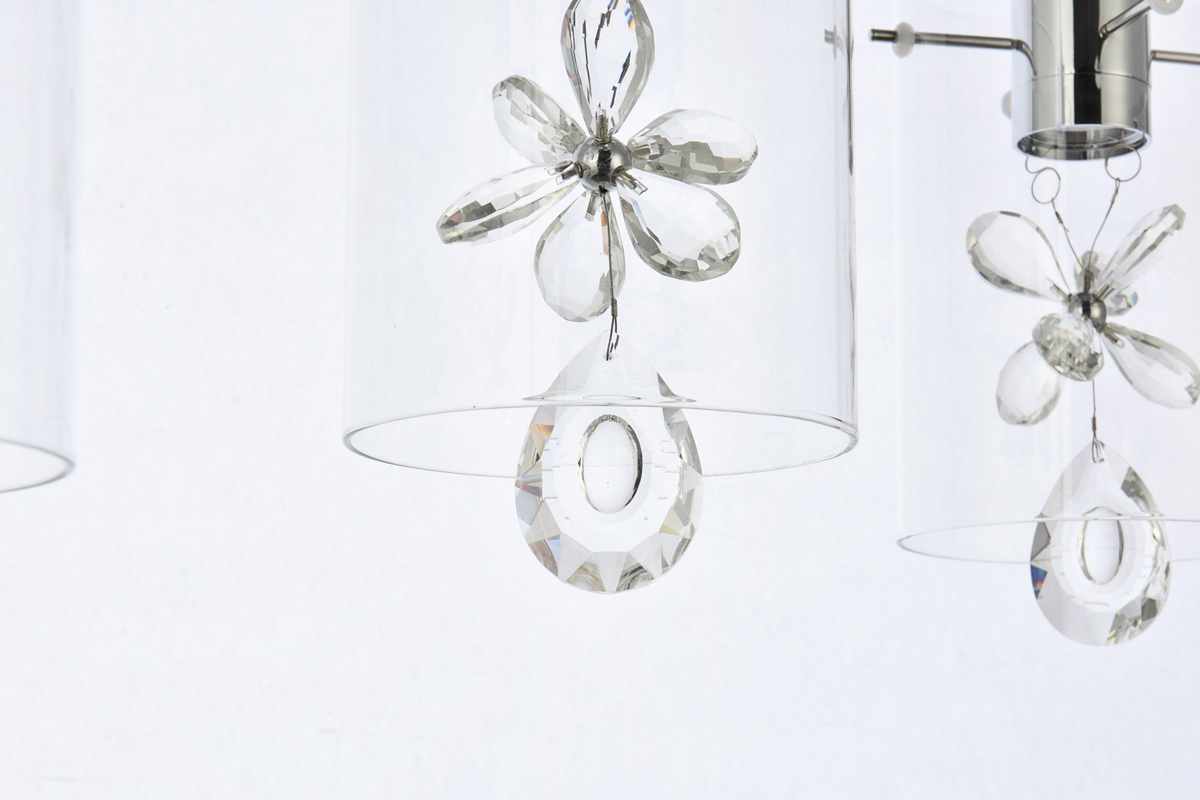 The Hana collection sparkles with an extraordinary display of faceted crystal pendalogues, creating the illusion of a shimmering cascade of ornamentation pouring from a sleek metal canopy. These fixtures would be a commanding visual presence in any room, and will fit comfortably in smaller spaces. Lighting illuminated with led diodes emitting 3000K soft white.